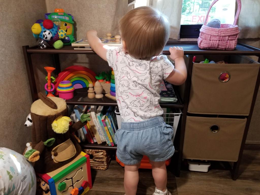 Creating an inviting space for her to play was high on my priority list. By freeing up space on the floor, we were able to bring in a small shelf to store her toys and books. She is at an age where she is transitioning to different kinds of toys, so figuring out what to bring was a challenge. We needed to limit what we brought but maximize the learning and fun potential. I picked toys that she can play with now but grow into over the next few months. For books, I brought her favorites as well as the books that start focusing more on learning words and vocabulary. It is easy to think that we are hitting the road with a 1 year old, because that is what we know, but trying to think about the learning she will do in the next 6 months alone is mind boggling.