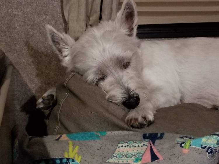 We know that there will be times when we are unable to take Daisy with us to various places, and so planning for how to contain her when we have to leave her at the camper was also a big thing we had to consider. In our townhouse, she had a gated area near our laundry room where she had a bed and water and could move around (not that she ever did). We considered several options for the camper but were mostly concerned with how she would react to whatever solution we came up with. We ultimately decided on just leaving her in the main living area of the camper. We can close off the doors to the two bedroom areas, and she has access to her water and the places she likes to lay. When we do leave, we close the blinds to minimize what she sees outside, which hopefully minimizes her barking and getting excited while we are away. We are blessed with an air conditioner that helps us know she is being kept cool, even when the temperatures outside are hot.