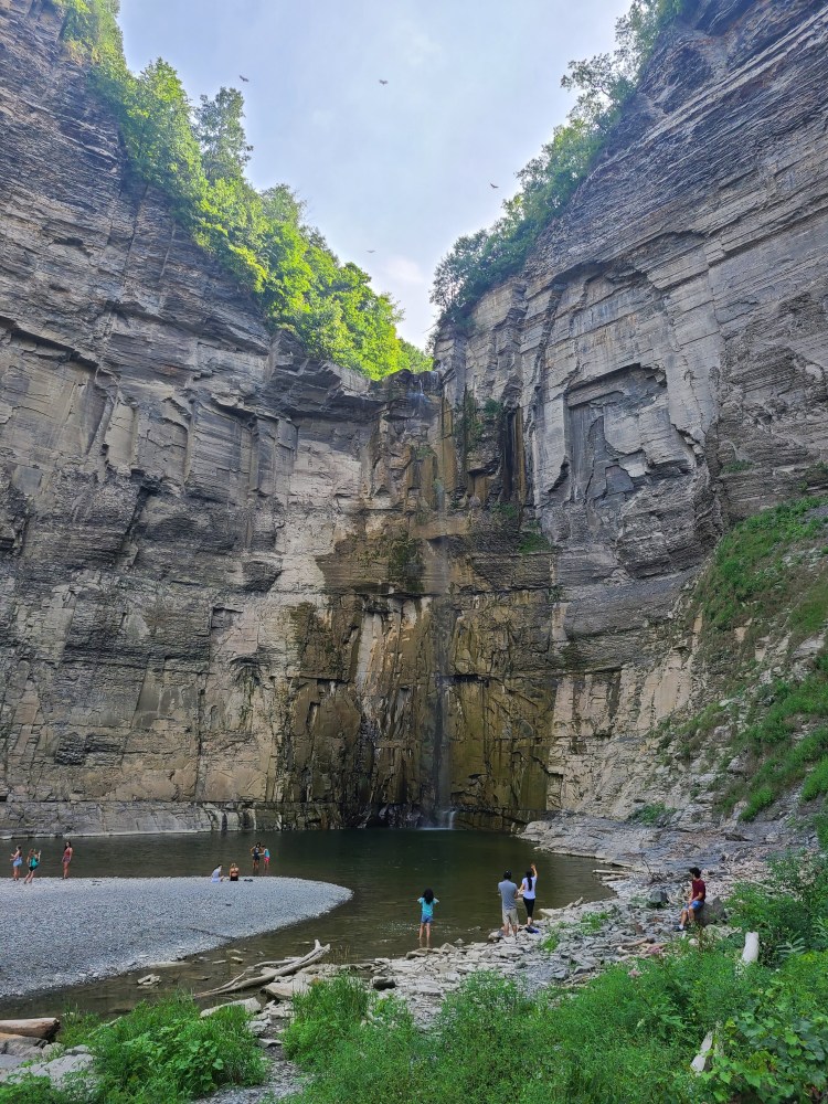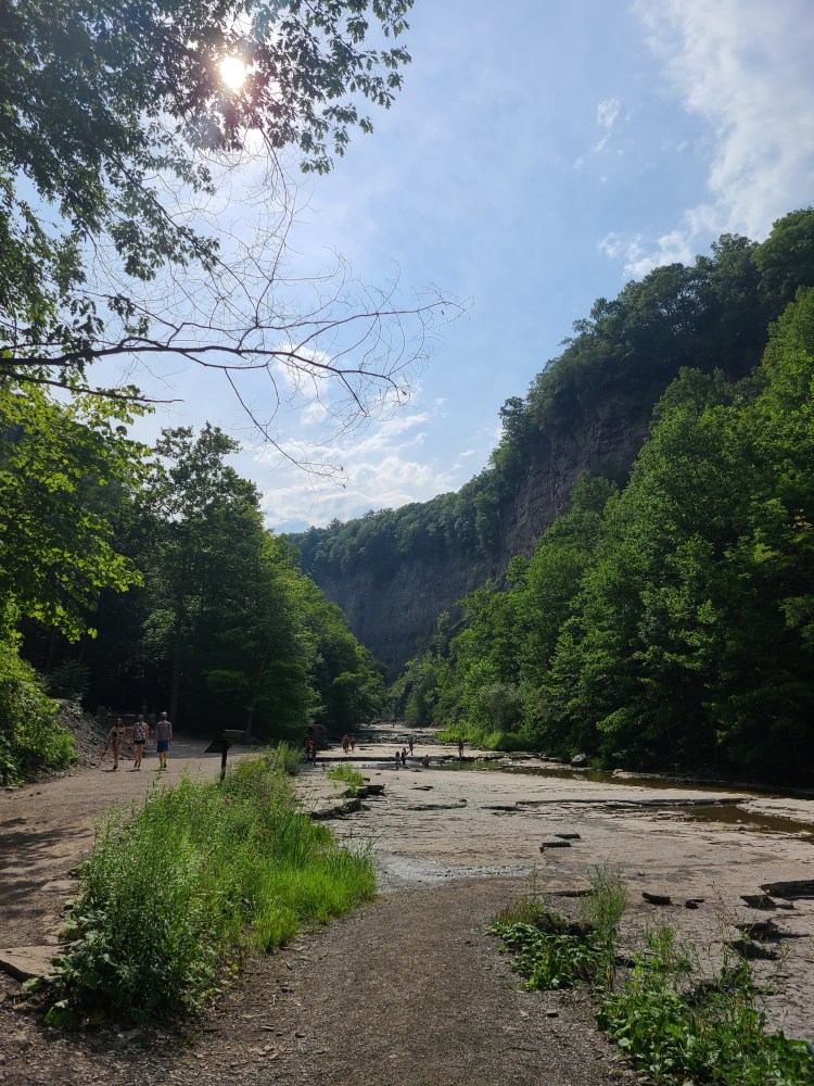 Regardless of the length of the trail or our moods getting to the falls, the hike was 100% worth it. The trail was in great condition – and we could have taken the stroller, which likely would have made it at least marginally more enjoyable, but we live and learn! The Gorge Trail follows Taughannock Creek. There is a small waterfall right at the beginning, which was even smaller than normal due to the drought. The creek bed is limestone and you can hop down from the trail in many places and walk on it. It was neat to see how the water has eroded the limestone in places.