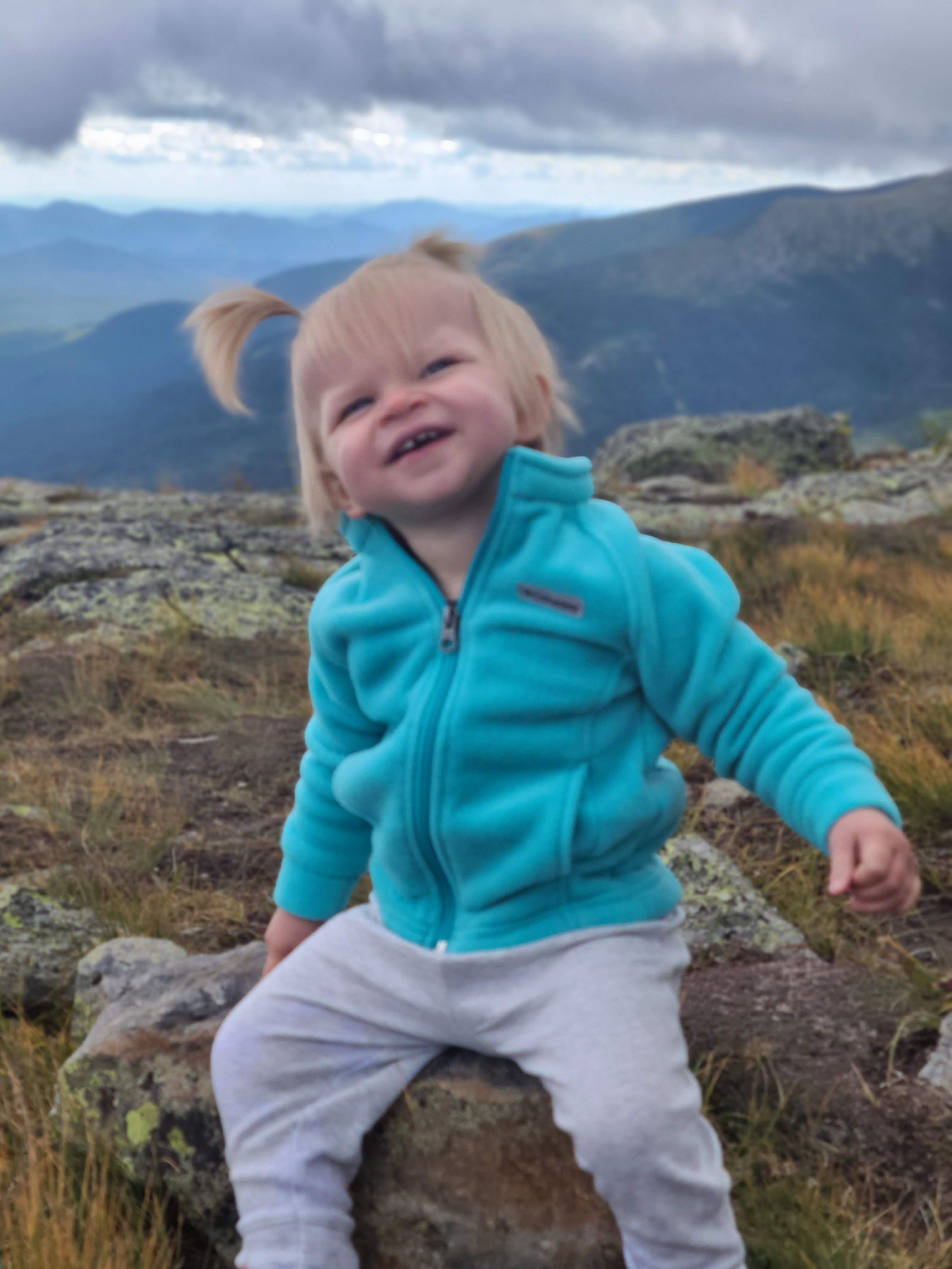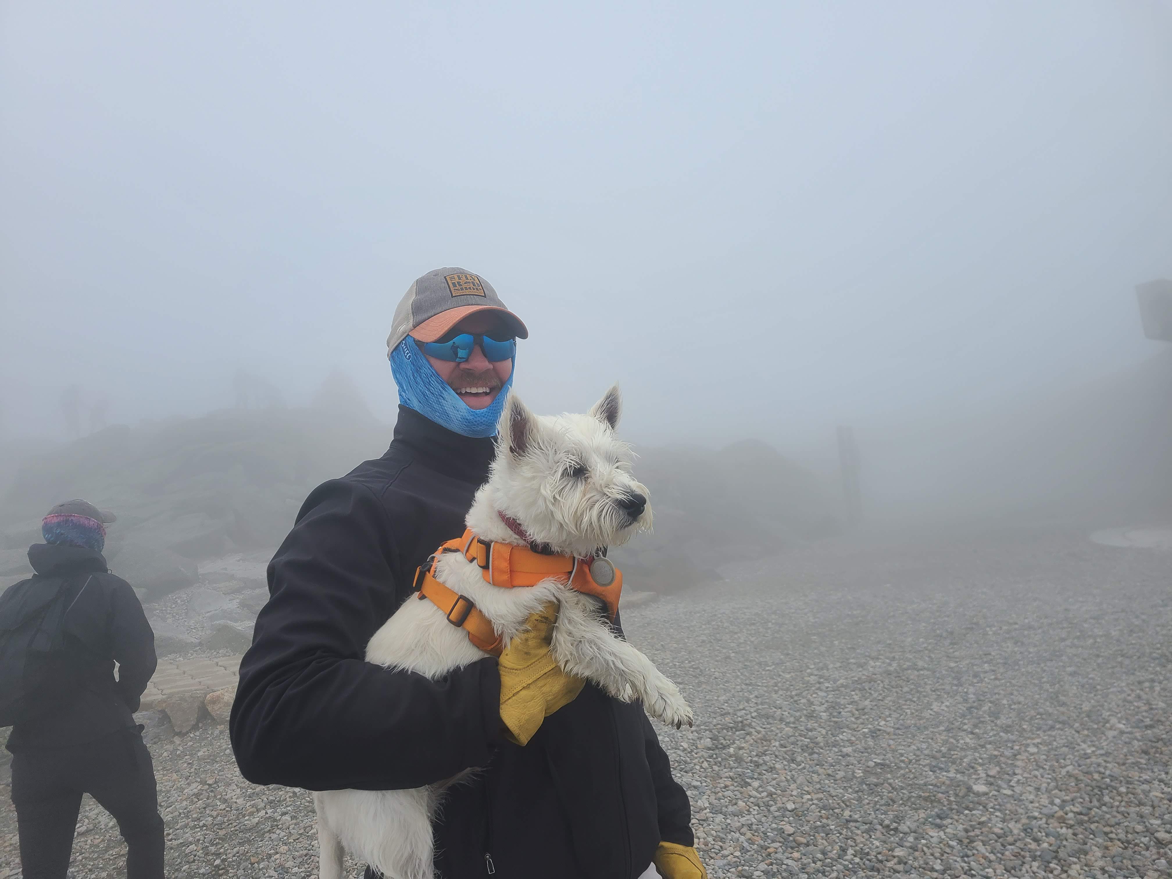 Once we reached the parking lot at the top, we bundled up in our winter gear (while strategically opening only one door at a time to limit the wind gusts through the truck), strapped Little Bird to my back, tethered Daisy tightly to her leash, and made our way up several flights of stairs to where the gift shop and visitors center (which is currently closed due to COVID) stand. We followed some hikers beyond these buildings to the actual summit of the mountain for our obligatory photo. I felt a little guilty getting our summit photo after walking only about 100 feet when these folks had put in all the hard work.