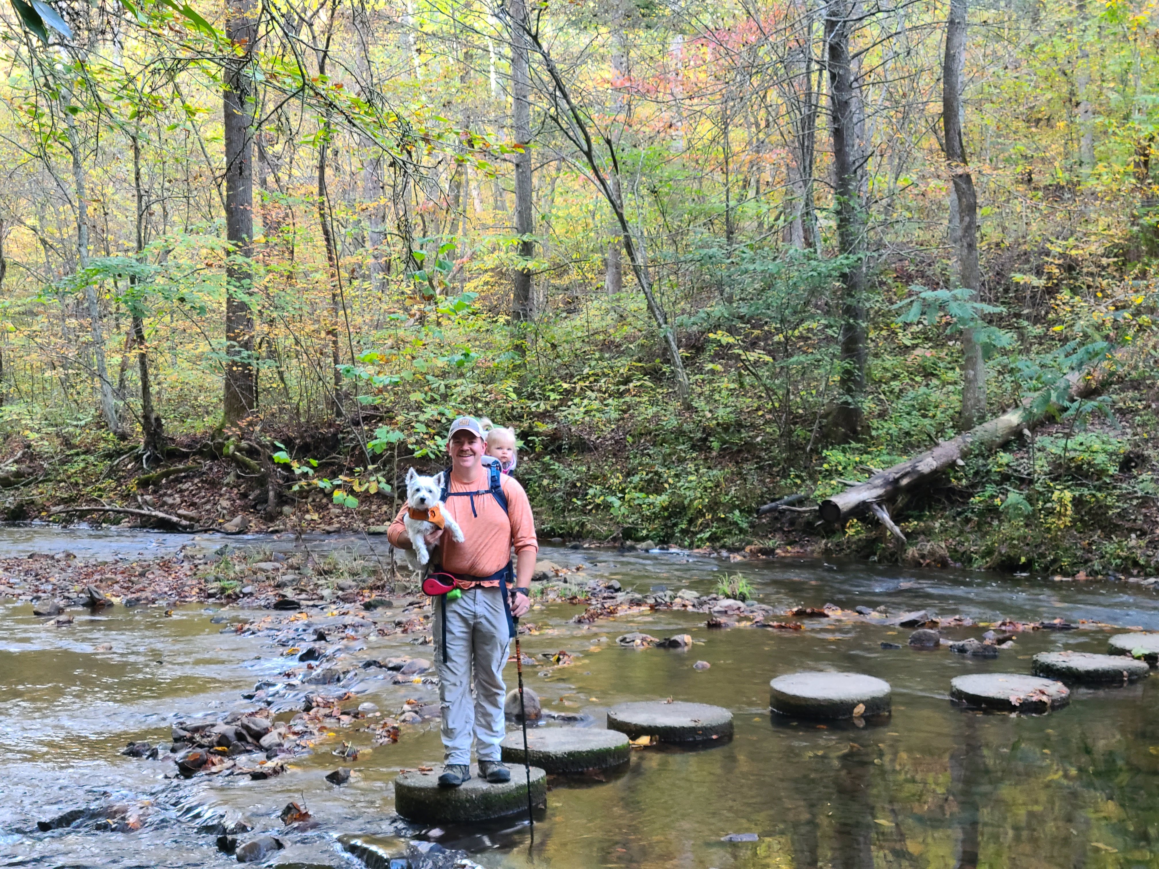 The hike was a loop trail around the lake, and we opted to start by the waterfall. We are so thankful we went this way. Immediately after the waterfall was a creek crossing. There were flat rocks spaced evenly across the creek, however, it seems that the creek has taken a bit of a detour since the trail was constructed. The final rock to bank jump was a little dicey, as was the steep climb up the bank, then the necessary crawling over rocks and down to the trail really tested our abilities. We slowly made our way to the trail with dog and baby in tow—okay, Will skillfully had the dog and baby, while I barely managed myself, but we made it!