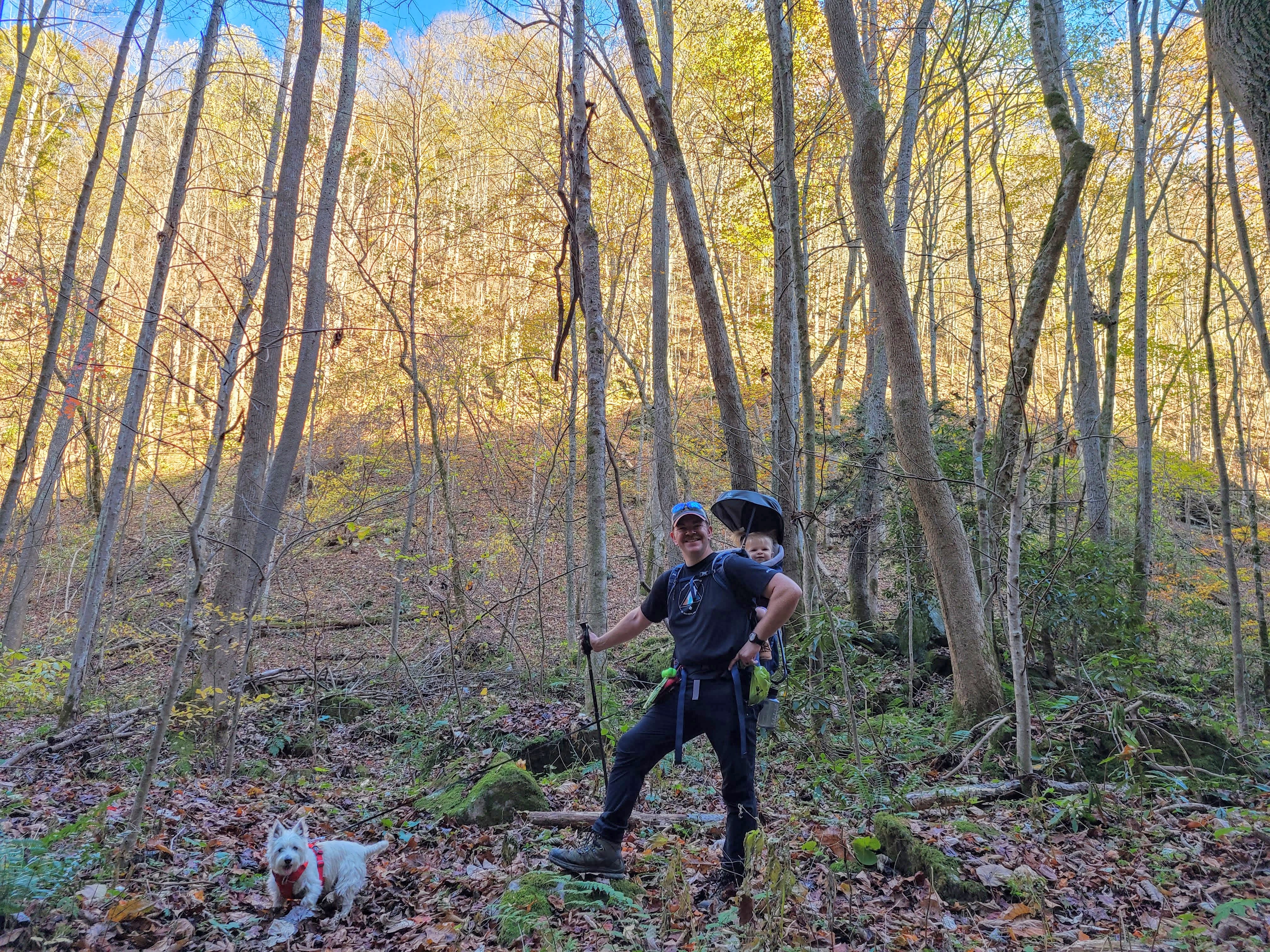 Of all the trails we have been on, I think this was by far the busiest trail we have seen. It was on a weekend, which we typically try to avoid, and there were several picnic pavilions right near the trailhead where people were having parties, which meant there were more people wandering up the trail. One thing that always surprises me when we encounter other people on the trail is their lack of preparedness. We have seen people hiking in sandals (not the type meant for rugged terrain) or, on this specific day, ballet flats going over rocks, across streams, and down steep grades. We frequently see people without any water sometimes several miles in. We tend to err on the side of over-preparedness, and we truly worry about those we pass along the way. Now that Will is carrying Bird in the backpack, we have had to adjust our thinking on how we carry water (since he previously used a Camelback) and just how much we need for the 4 of us. And that does not even take into account the first aid kit, knife, hiking poles, and boots we always have with us.