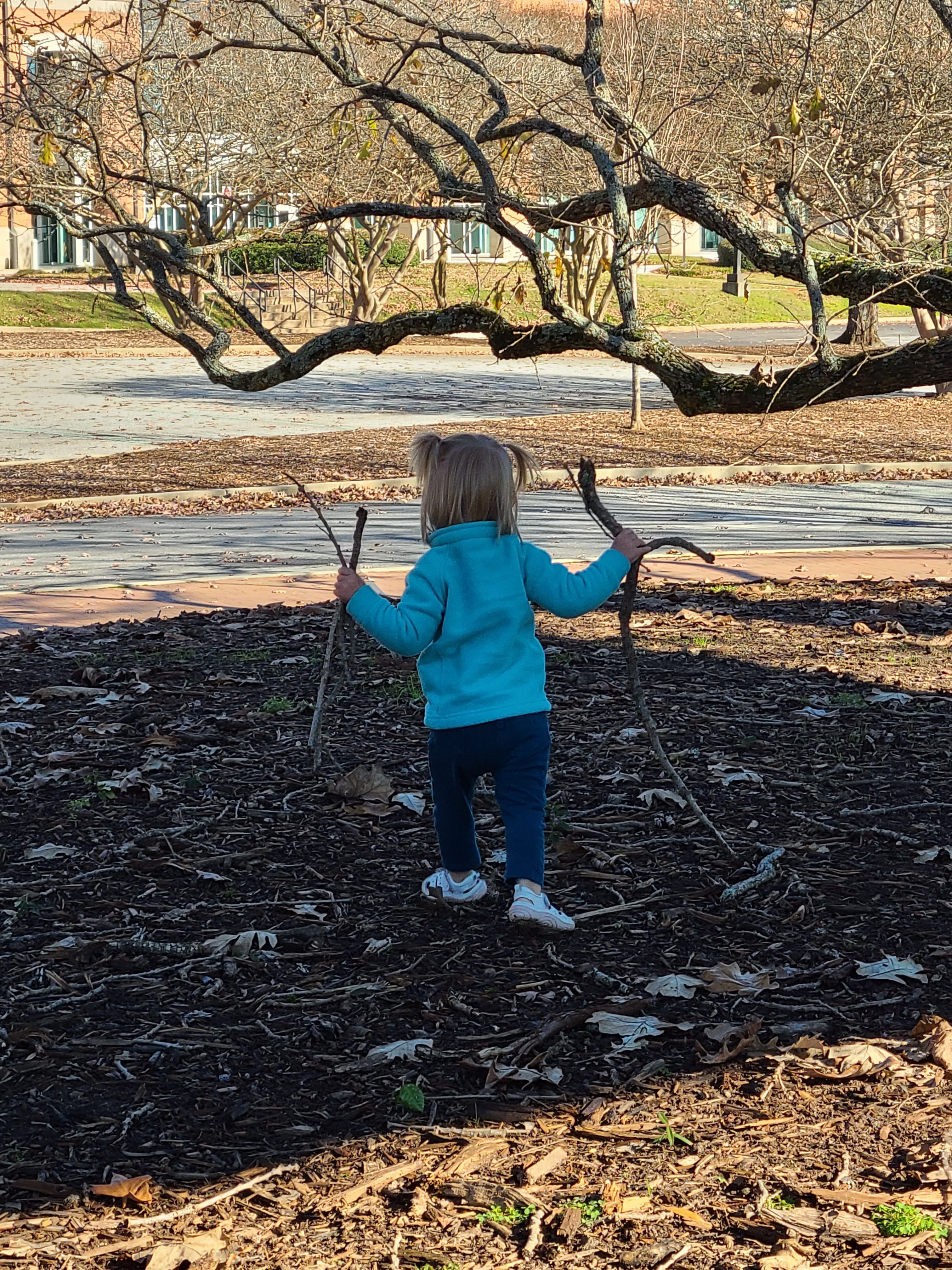 The Centennial Oak is the largest bur oak in South Carolina, and it is truly impressive. It is clear the university is going to any lengths necessary to keep the old gal alive and well, and we appreciated their efforts as it is really a sight to see. Of course, Little Bird was beside herself picking up all the sticks and running every which way around the tree.