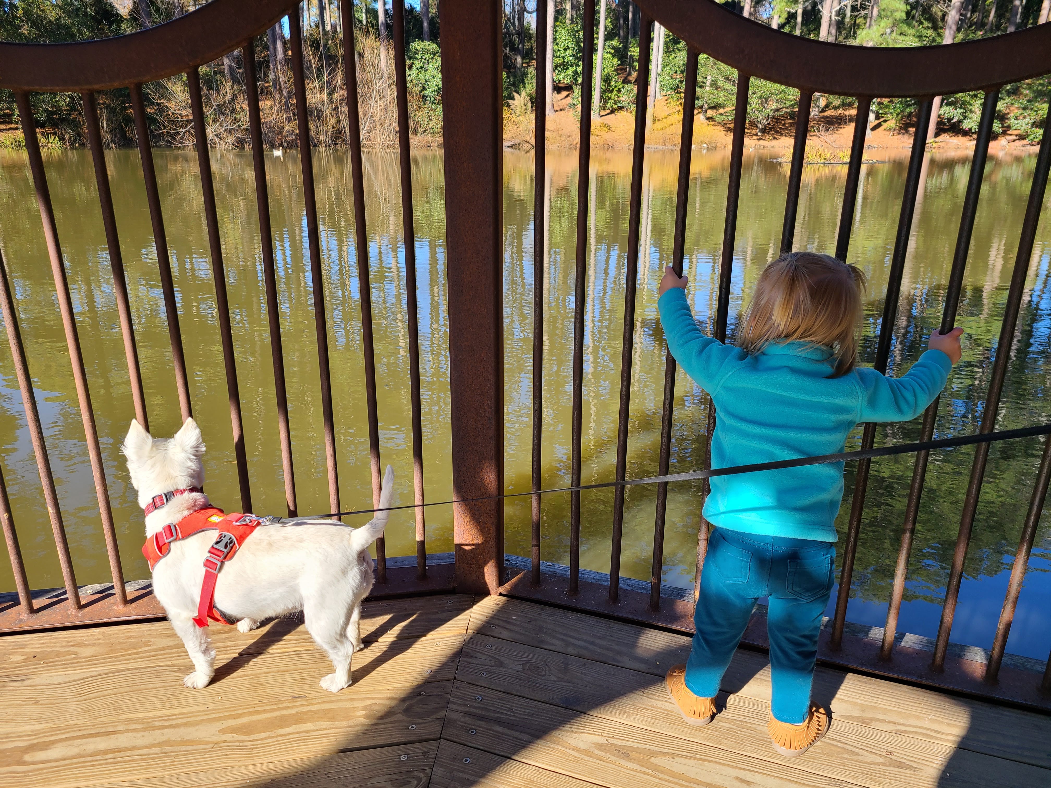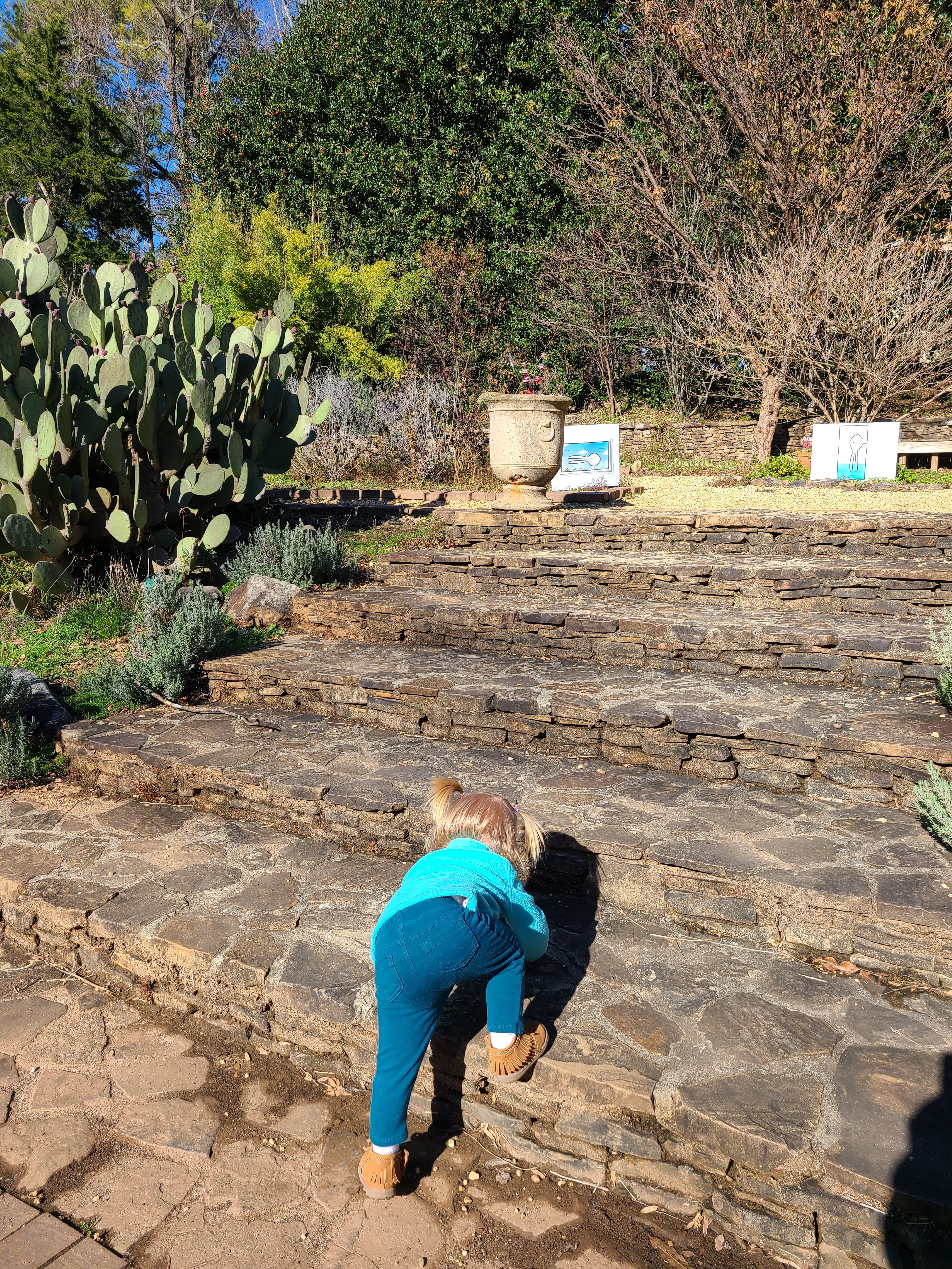 There was so much to explore in the gardens, and looking at the map, we know we only saw a portion of the property. Even in December, with only a few flowers blooming, the place was beautiful and so well done. A favorite of all of ours was the pollinator garden. In addition to some interesting facts and information on bees, there was an active honeybee hive where you could sit and watch and listen to the bees at work. We initially walked past this garden as there were other visitors there, but when we walked back by, we were the only ones there and took advantage of that time. Bird would wander through the garden or play on the patio but continued to return to the hive to watch and listen to the bees. It was also in this garden that Bird went to pick up a leaf that turned out to be a lizard’s tail, and I honestly do not know which of the 3 of us was more surprised!