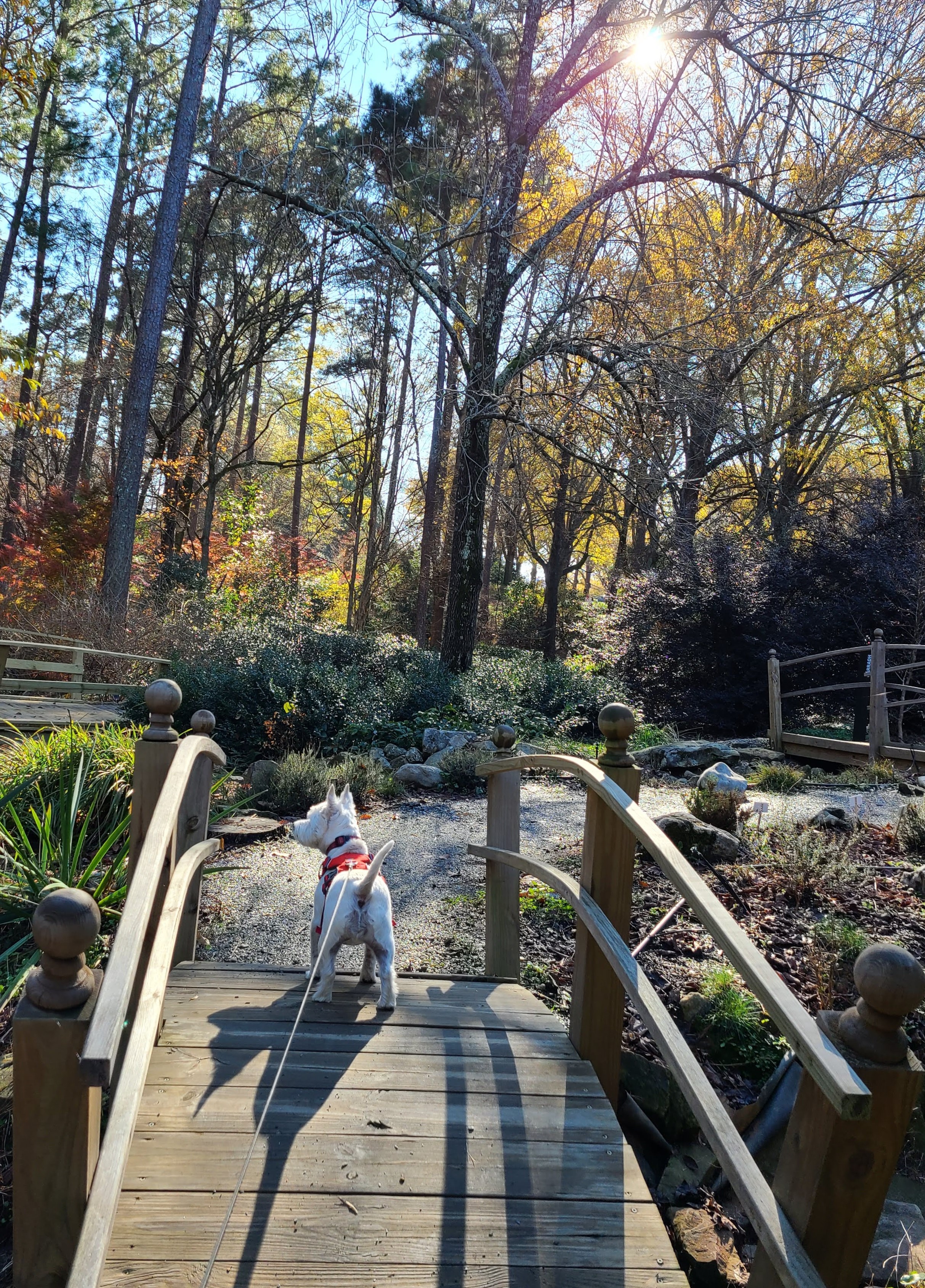 Once we finished our lunch, we made our way into the gardens. Within the botanical garden, there are quite a few smaller gardens that highlight a specific species (like the conifer garden), a general vibe (like the Celtic garden), or a specific function (like the pollinators). Within these gardens are many gifts from different graduating classes from Clemson. For example, we started our exploration at the caboose that was gifted from the class of 1939. Bird LOVED exploring the caboose, and we had to go up and down all of the stairs on either end. Even though we had the backpack with us, we let Bird run free for the most part, and she had an absolute blast.