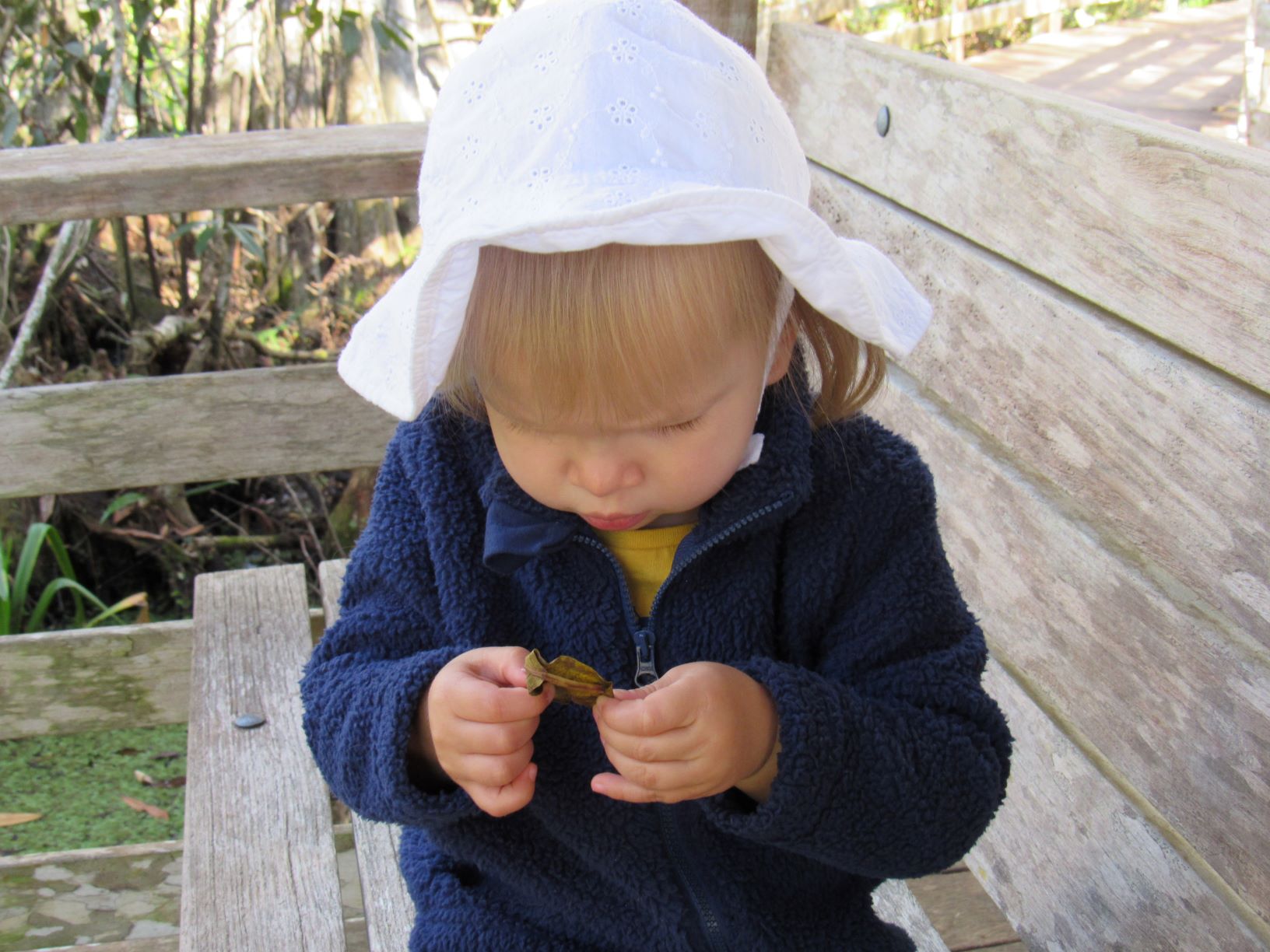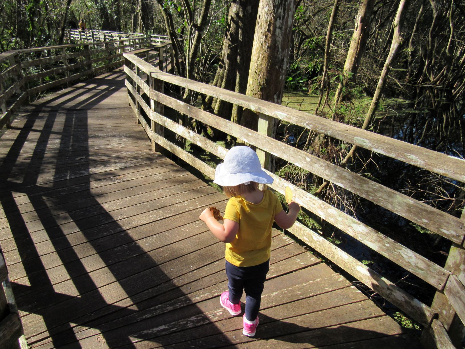 The entire 2.25-mile walk through the swamp is on a wooden boardwalk, which is perfect for taking a stroller and letting a very energetic toddler run safely. Little Bird had the best time picking up leaves along the boardwalk and listening to her feet hit the wooden planks under her feet. We also convinced her to stop long enough a few times to listen to the many birds around us. Even with a snack on the way, she was getting hungry and tired toward the end of our visit. After a mini-meltdown and some love from mama, though, we finished strong and were ready for our picnic lunch at the truck.