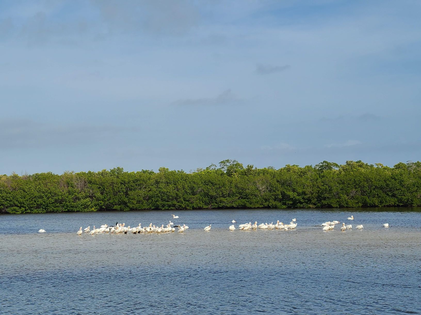The drive meanders through the mangroves and opens up in several places where we saw hundreds of white pelicans resting on sand bars at low tide and feasting on all the fish. It was really fun to get the binoculars out and watch the pelicans interacting, especially watching 2 spar bills and fight over a coveted fish. Bird loves looking at birds and really enjoyed pointing them out and watching them fly overhead.