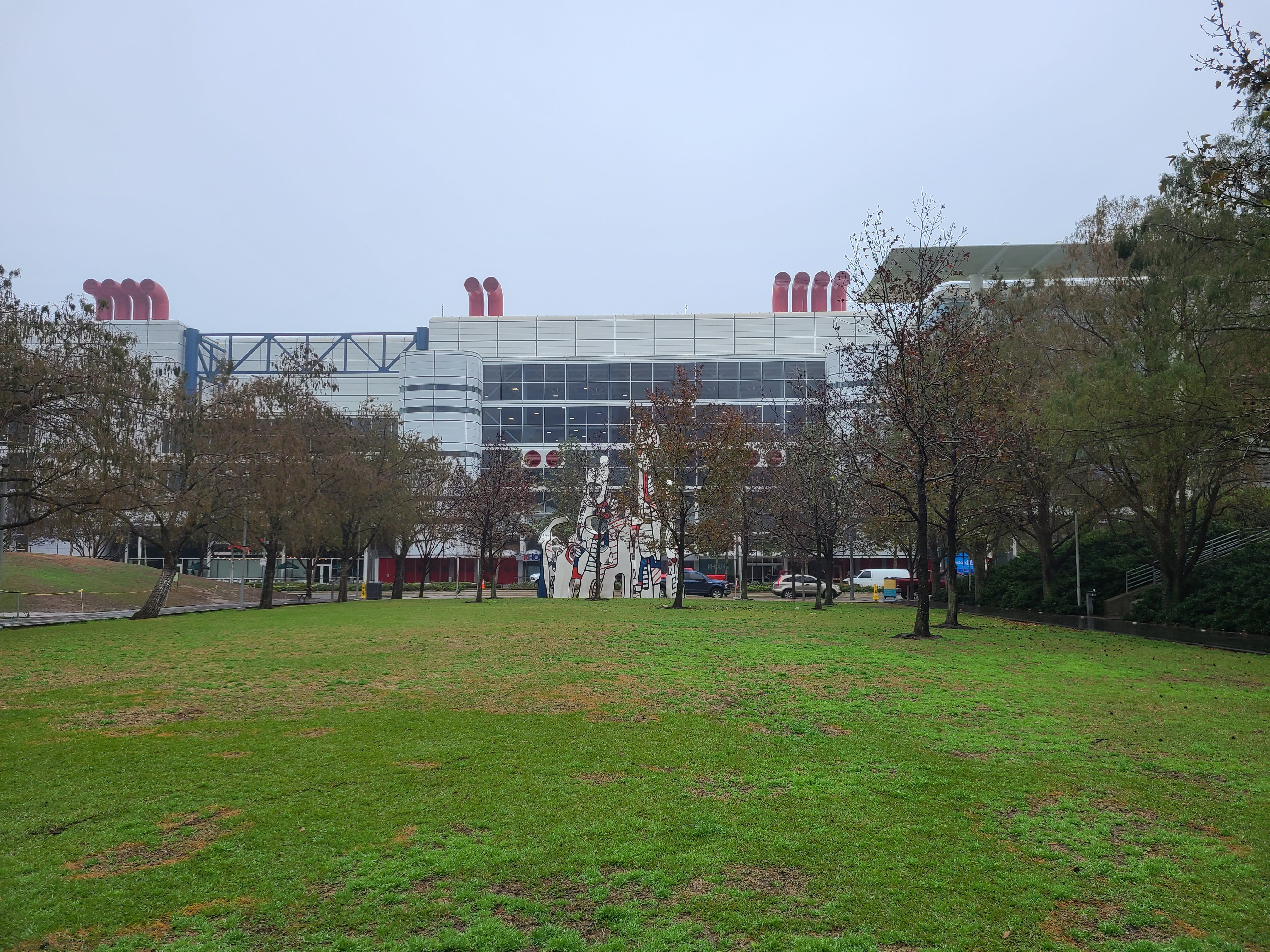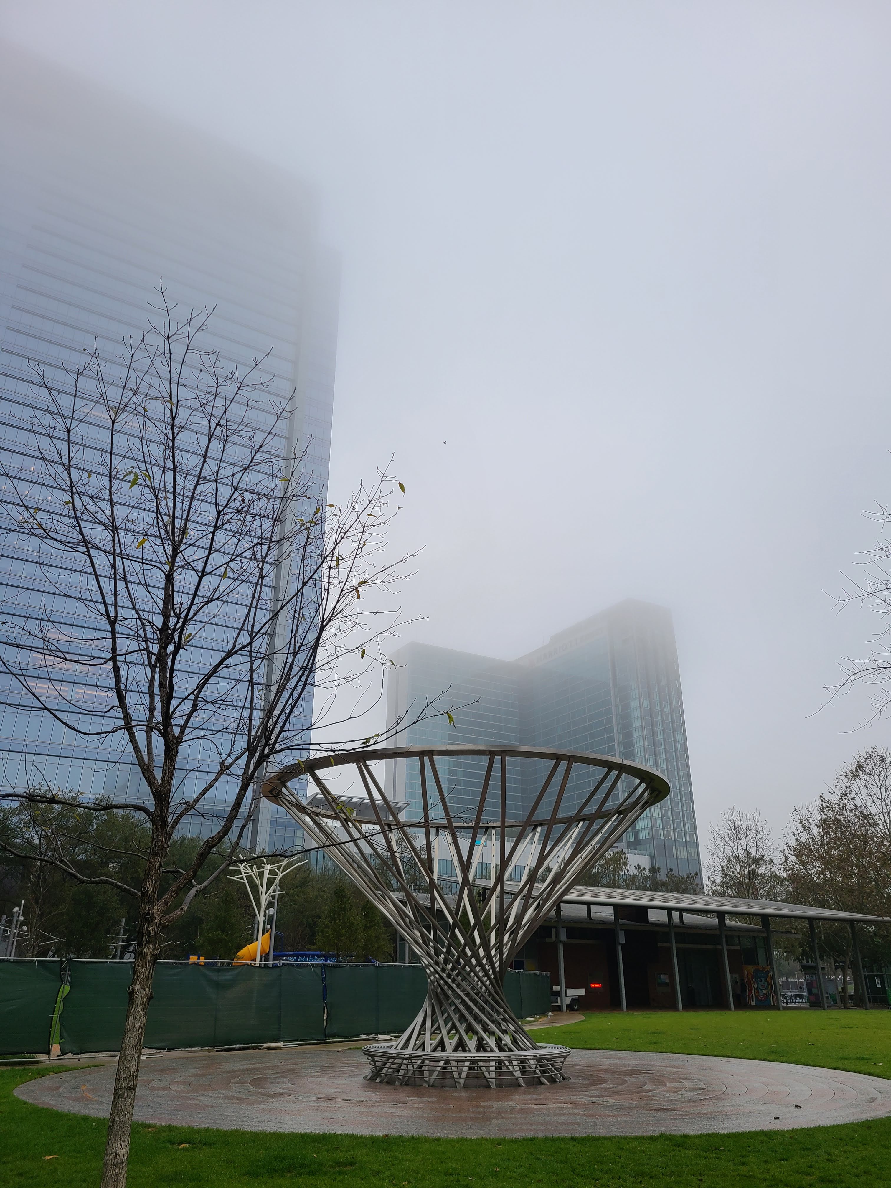 We made our way to downtown on the tail end of what would have been the morning commute, though based on the ghost town we drove into, COVID has shut a lot of things down (as we expected and have seen in every city we have visited). Even on a super foggy and off-and-on rainy day, we found a parking lot and bundled up to take the girls for a walk. We made our way to Discovery Green where we knew we would be able to let Bird run wild and free, and since this adventure also included puddles, she was over the moon and 100% there for it. We were virtually the only ones out and about (we saw a few people walking and a few construction workers, but it was quiet), which combined with the weather, really created a mood.