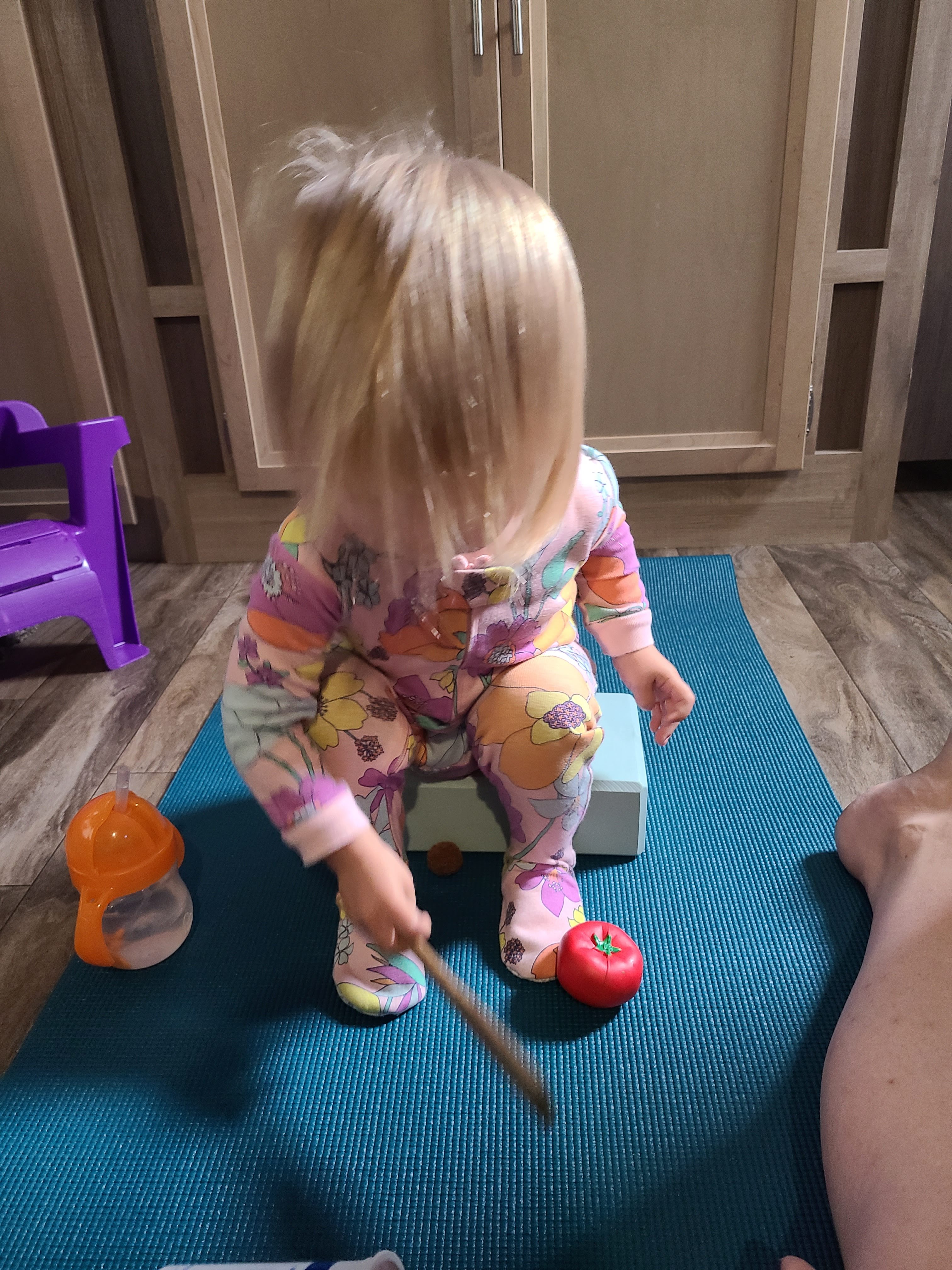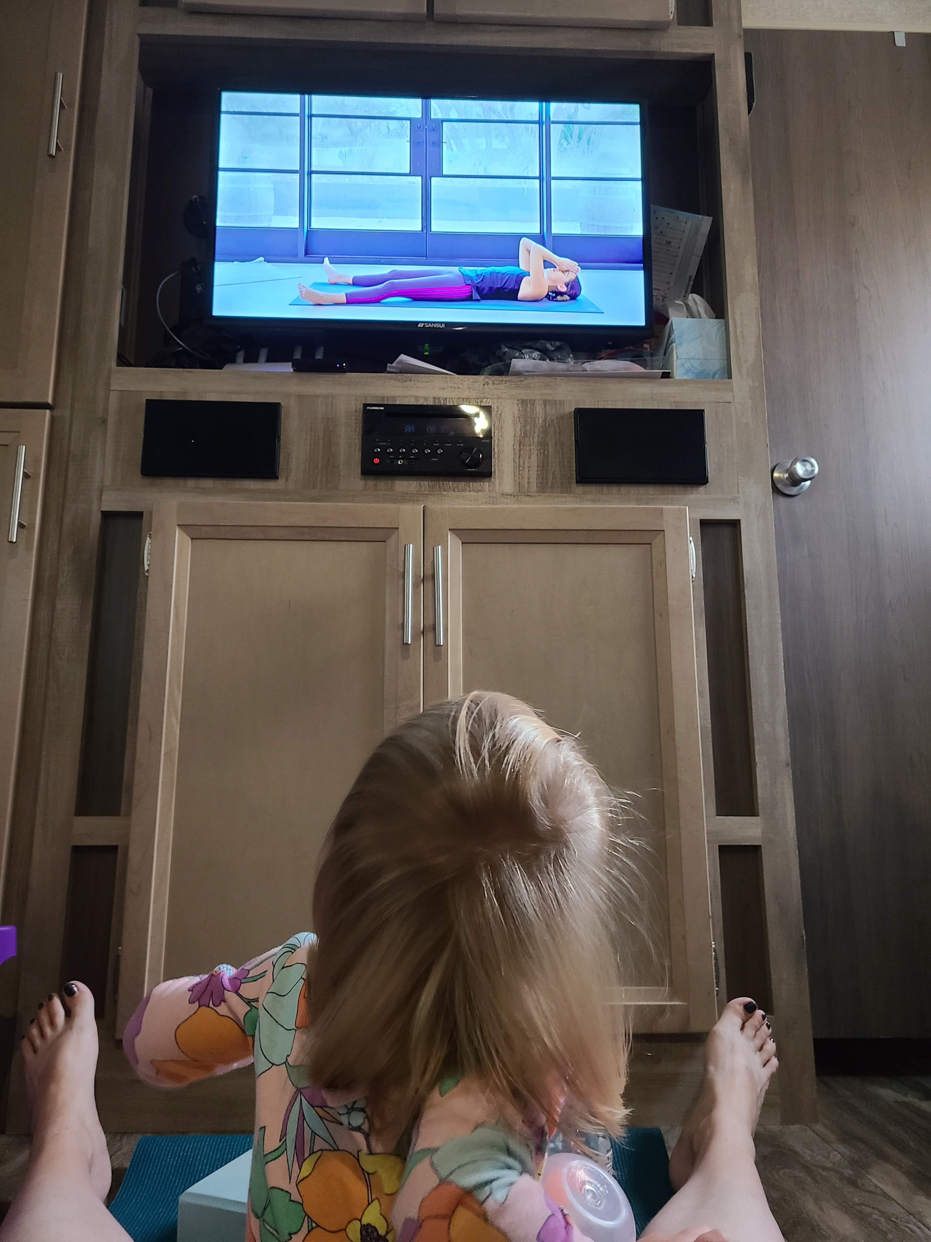 Doing yoga in a camper definitely has its challenges, but I managed a decent set up as long as no one else needed to do anything for the duration of my practice (Bird did join me one morning when she woke up earlier than normal, but it was fun to have her playing around even if it was not as productive as it could have been). As long as I stay perpendicular on my mat, I rarely run into counters or the dinette (LOL). Additionally, ensuring that we had internet service was an important consideration. Except for 1 day when I was sick and 1 day when we were boondocking and service even for our phones was spotty, I completed each session on schedule (when I did miss, I doubled up the following day to stay on track).