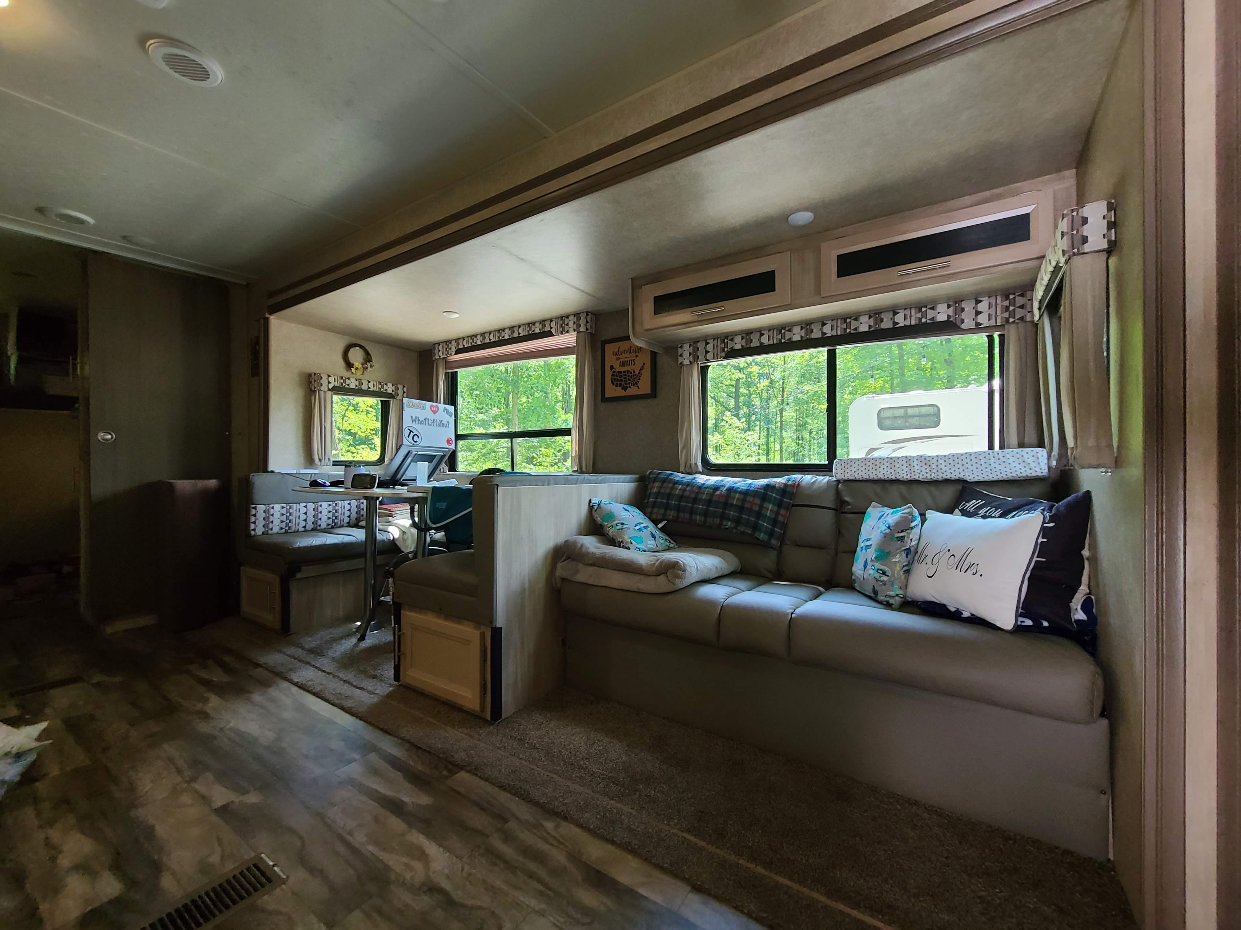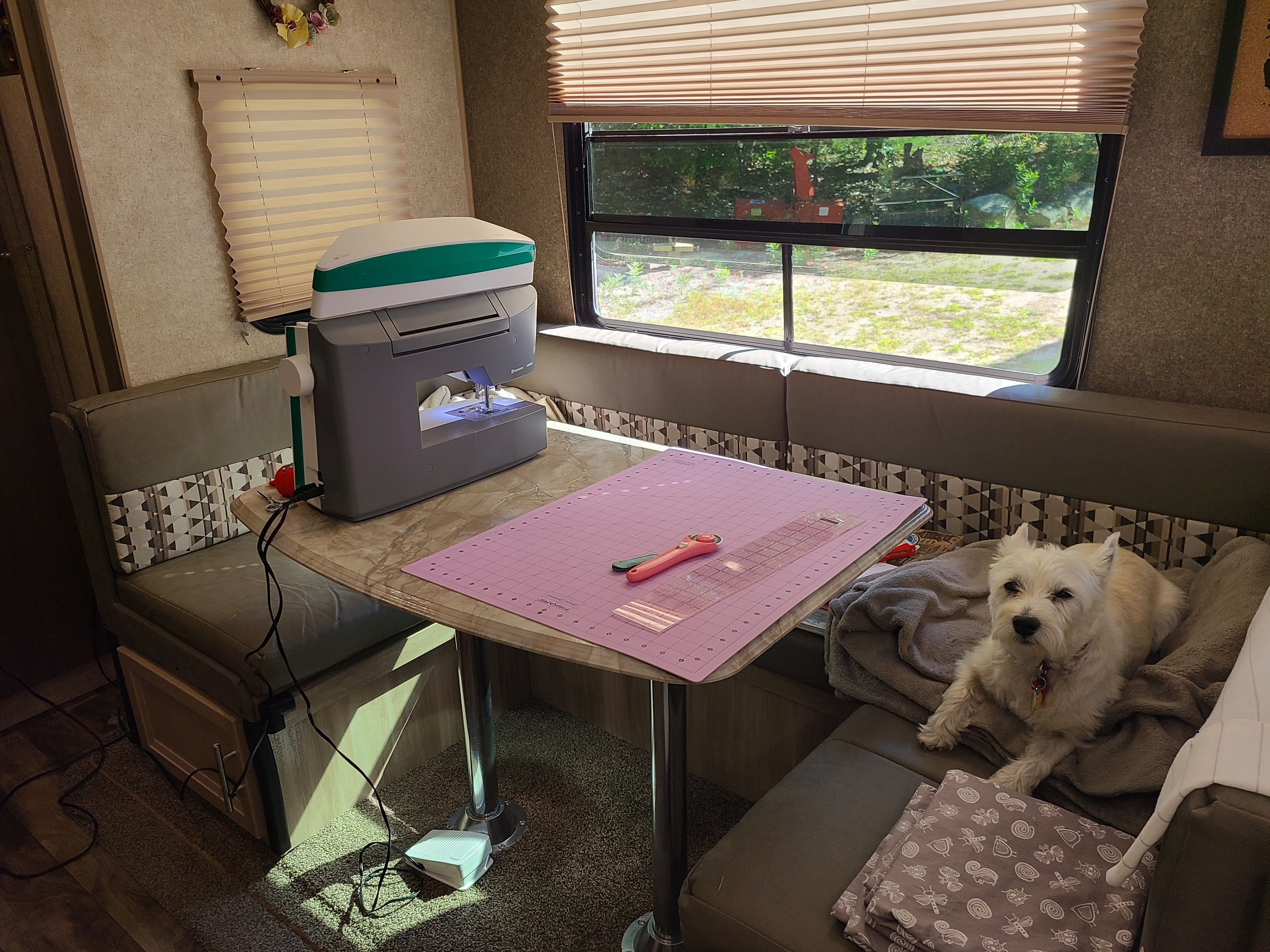 We set out on this adventure to get back to what we love, and that includes being able to do the hobbies that we love. I am so happy to have my sewing machine and accessories with us and to be able to show that you do not need a fancy space—or even a very big space—to sew.