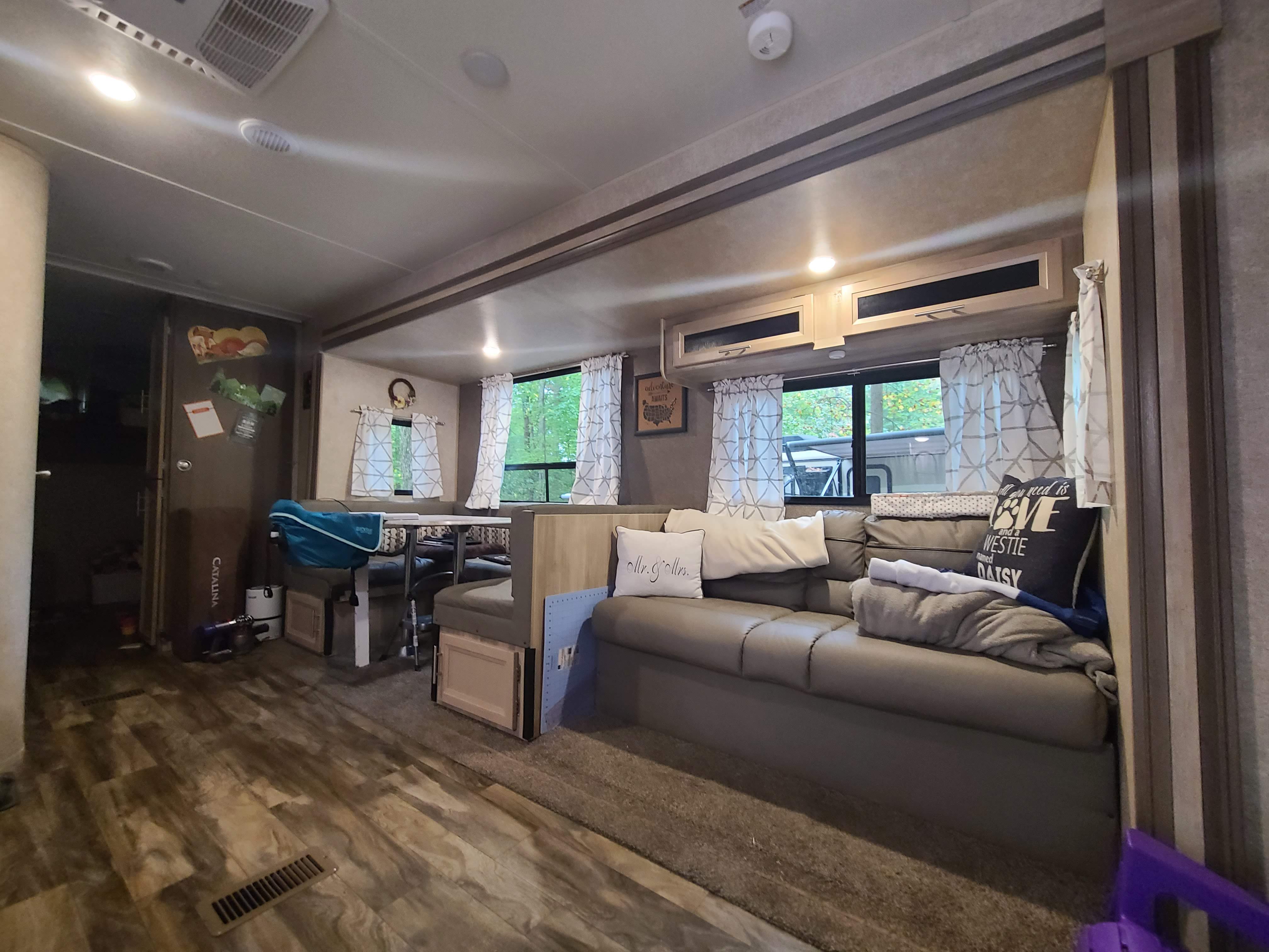 I started small and repurposed curtains from our townhouse for above the kitchen sink and our bedroom. Just seeing the difference those 3 sets of curtains made, I knew I had to do the rest in the living room/dining room area. These windows were much larger than the 3 I had completed and definitely took some creative maneuvering, but the finished product made Cate feel like home.