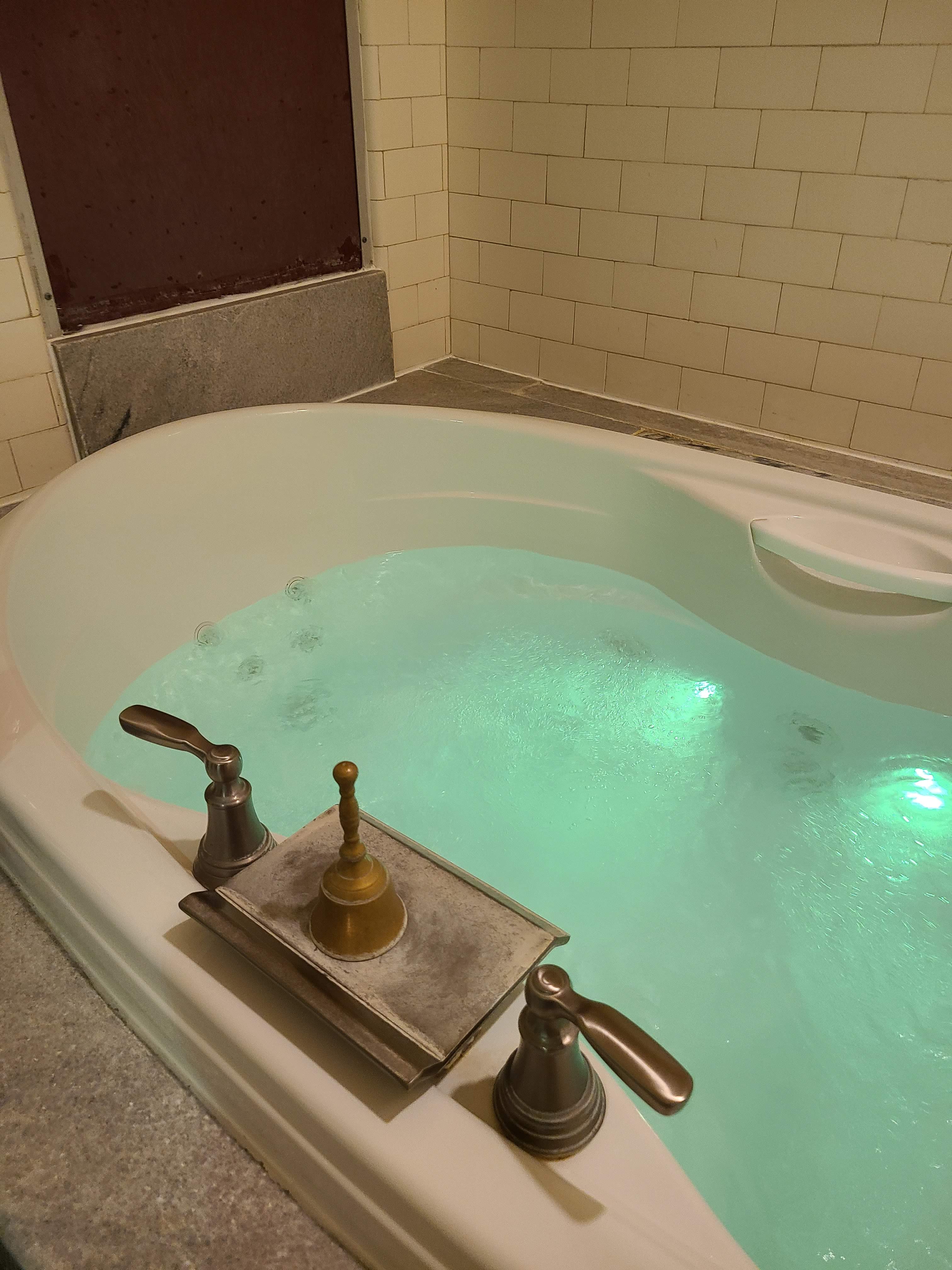 The bathhouses are very historic and have been updated enough to make them modern but still have a bit of rustic feel to them. When my name was called, I was led into a room with about 12 private rooms with bathtubs around the perimeter. The center room had nice tile floors and a gorgeous stained glass ceiling. It felt very European in a way. The private rooms were less fancy but had a nice tub with jets. The bath attendant gave me a quick run down, including instructions to ring the bell if I started to feel lightheaded or faint, and I was left to get ready and enjoy my 20-minute bath.