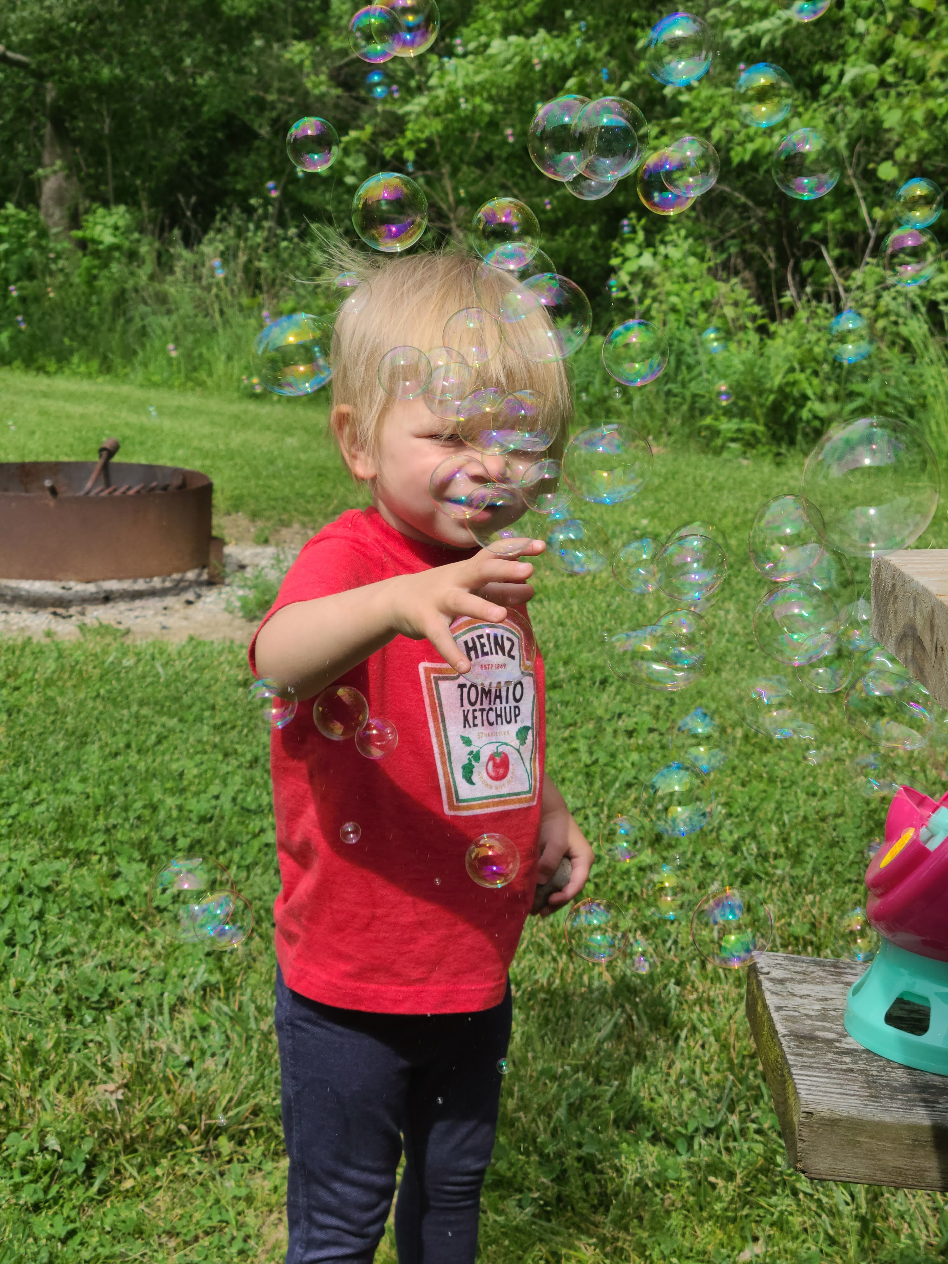 Our site only had electric hookup, but it was one of the nicest spots we have had on this journey. Each spot was set off from those around it with a small patch of trees and bushes, making each site incredibly private (especially now that the vegetation is in full force). In addition to the privacy, we had an actual yard that was bigger than most of the entire sites we have had. The lush green grass went from our door to the edge of the trees and was the perfect place for Bird and Daisy to play and for us to break out the bubble machine, which was not surprisingly a huge hit.