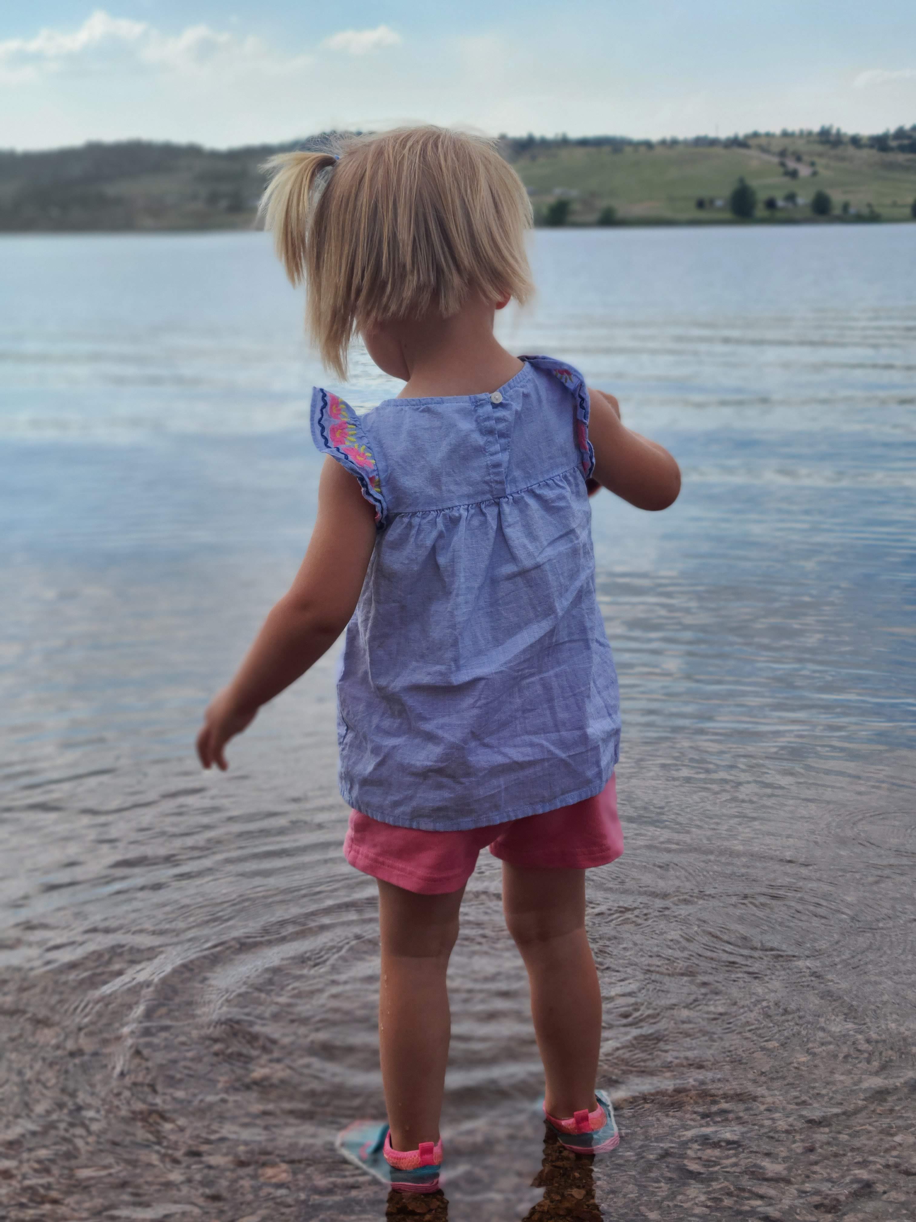 As soon as we arrived, the only word we heard from Bird was “lake,” so shortly after getting set up, she and I headed down to check it out while Will relaxed from the drive and started dinner. The shore was nice and sandy and had far fewer ants than we had encountered at previous lakes, so it was immediately much more comfortable and an obvious hit. All Bird needs is a bucket and some water, she will supply the rocks and sticks, and she will entertain herself for hours. Thankfully, she listens well and only wades in so far before stating “too deep” and turning back toward shore.
