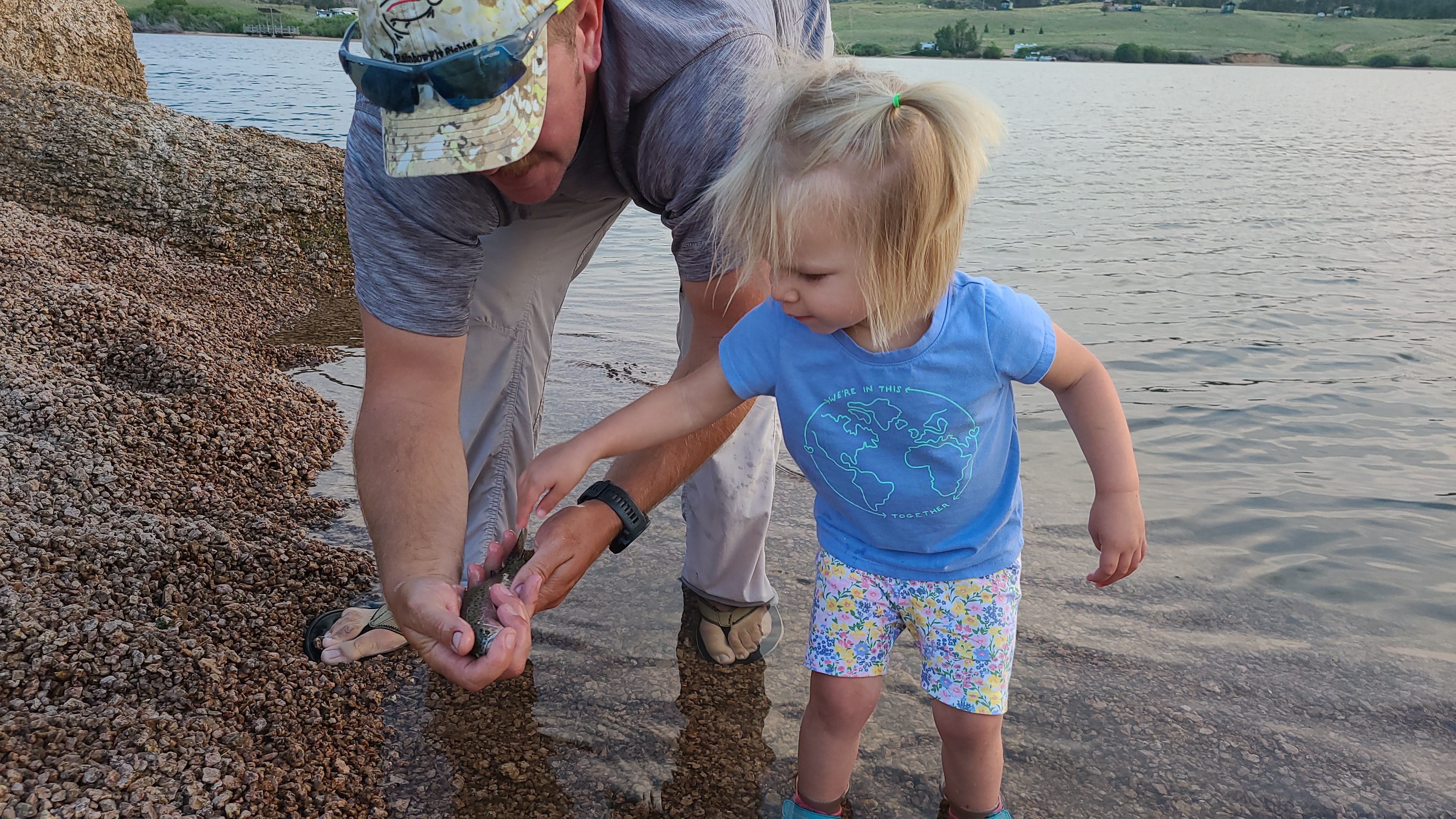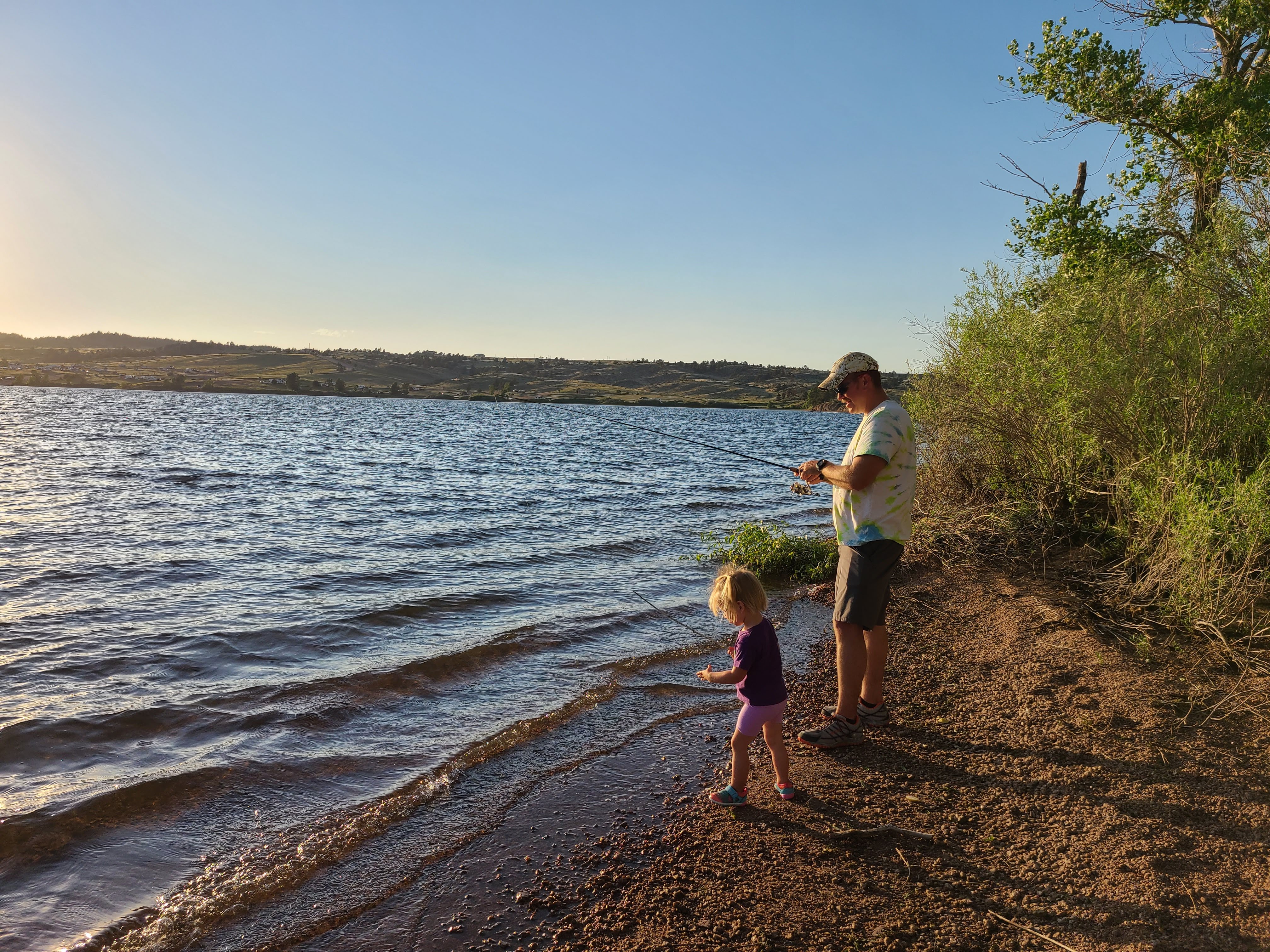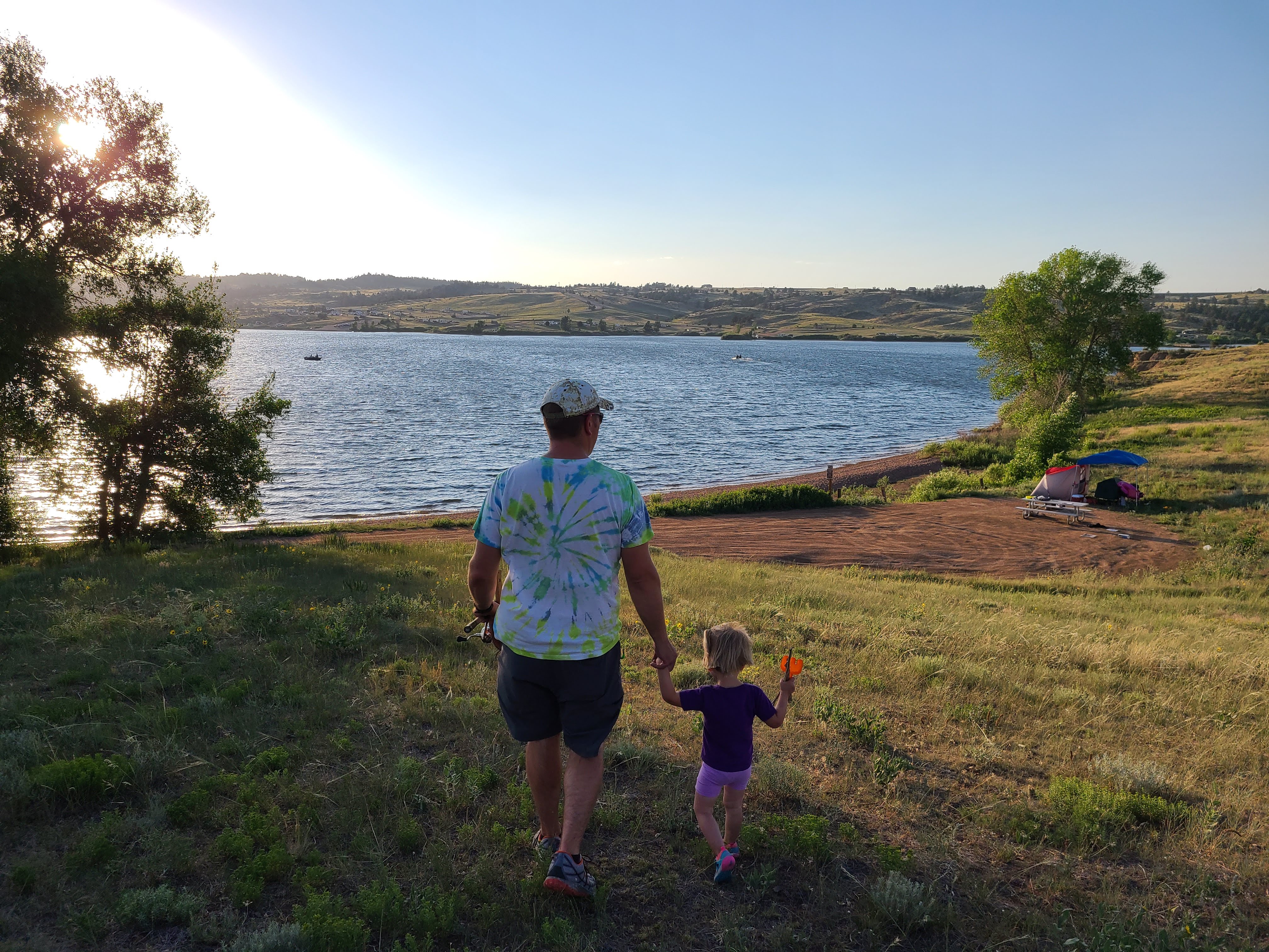 During our stay, we made many trips to the lake, both directly down from our campsite and also further around the lake. There was an awesome trail system, though primarily geared toward mountain bikers, all throughout the state park that we used to get to different areas of the lake. On one such outing, Bird helped Will reel in her first fish. And after she touched it, examined it closely, and watched it swim away, she promptly shouted “again.” If only it were that easy.