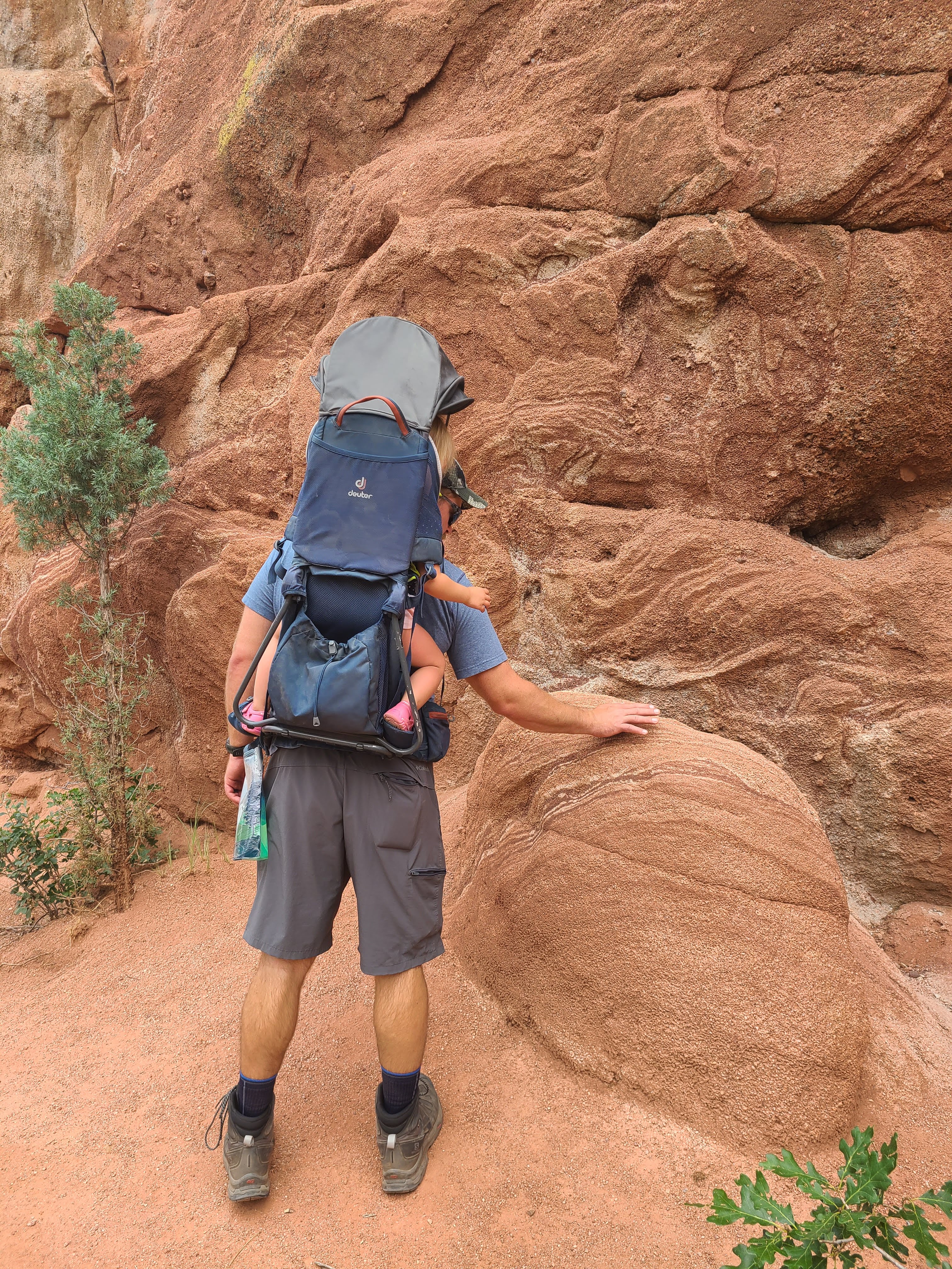 The centerpiece of the open space, the incredible rock formations, were a sight to behold. Bird was beside herself with the rocks darting up all around us and the views stretching for miles below us. More and more, these days, she is asking to touch the rocks or pointing out different things she sees (like the “window” [hole] she spotted in the formation above us at one point where you could see blue skies on the other side). She also has quite the eye for seeing birds, squirrels, and, of course, dogs and people.