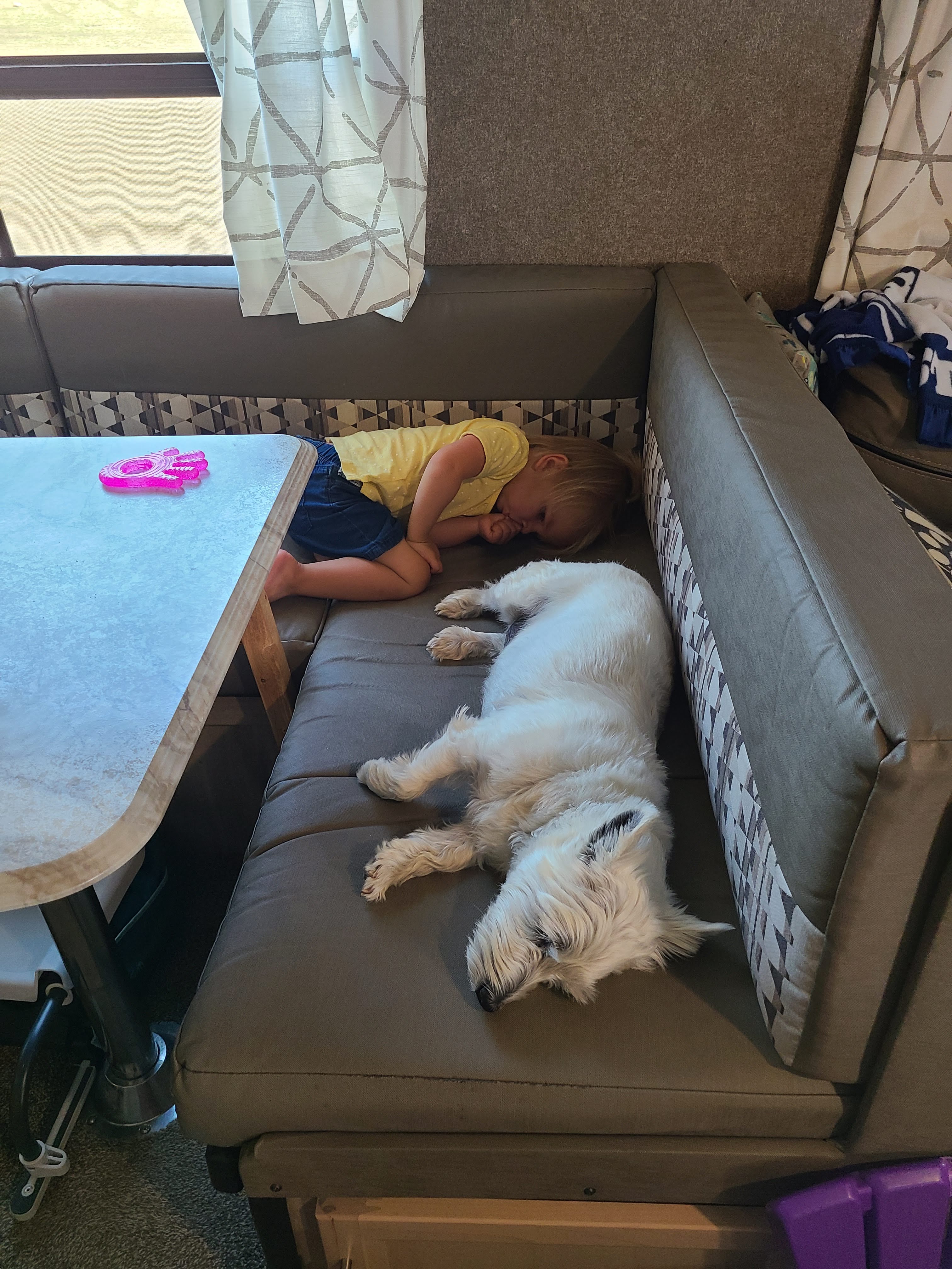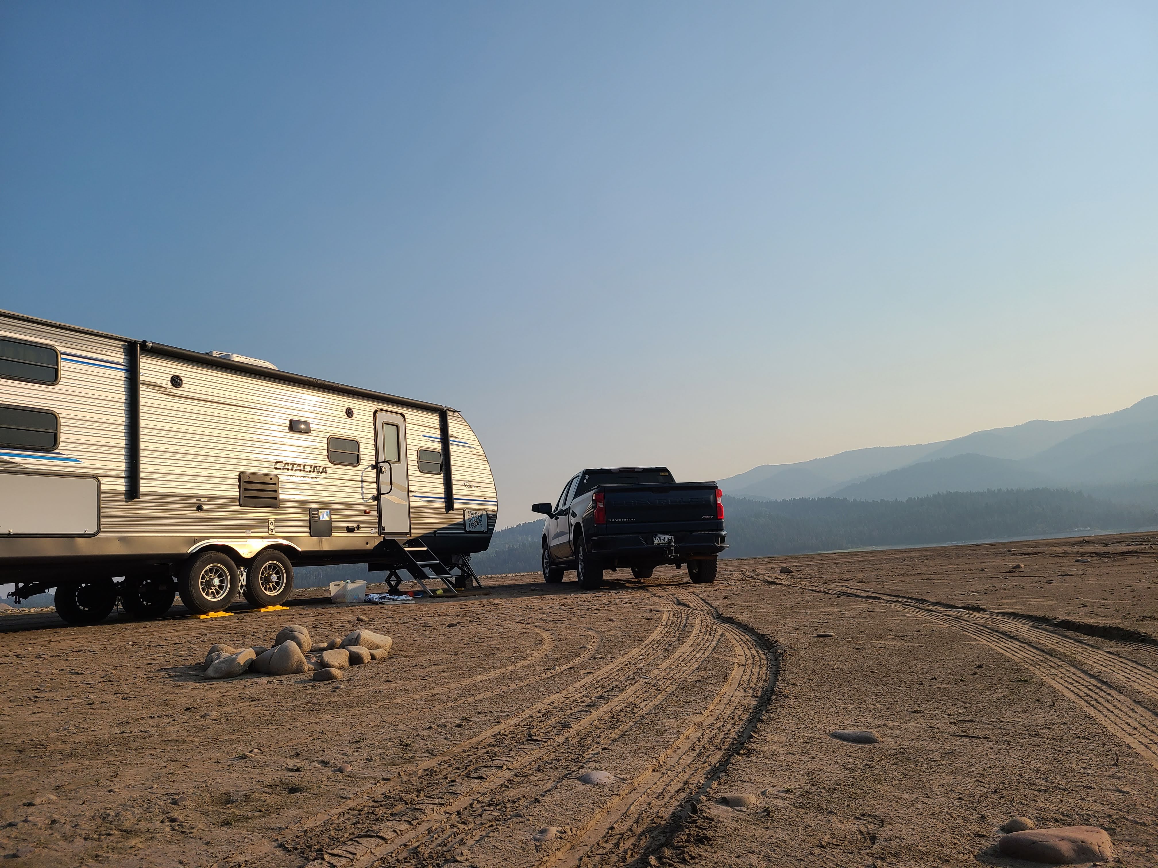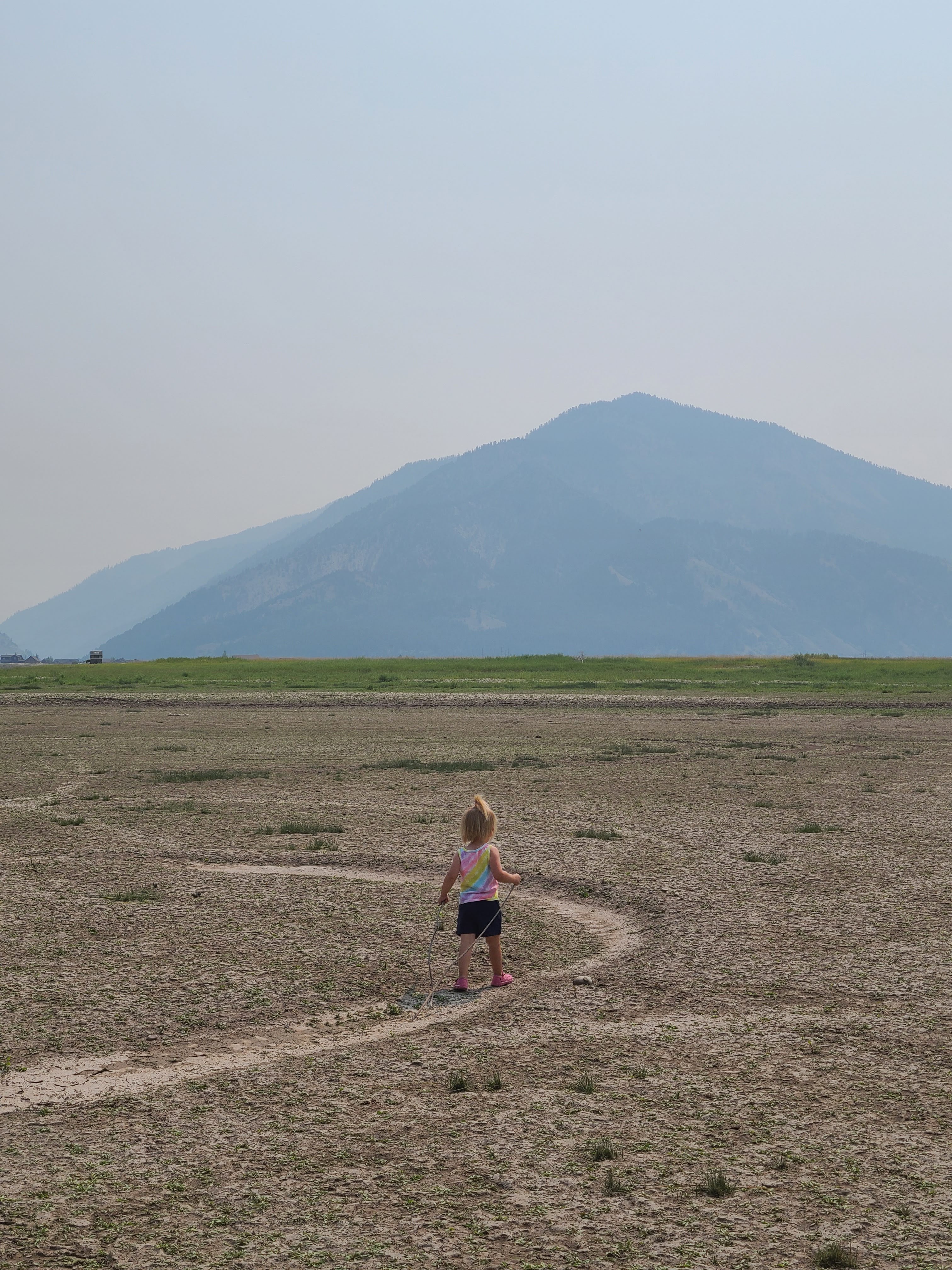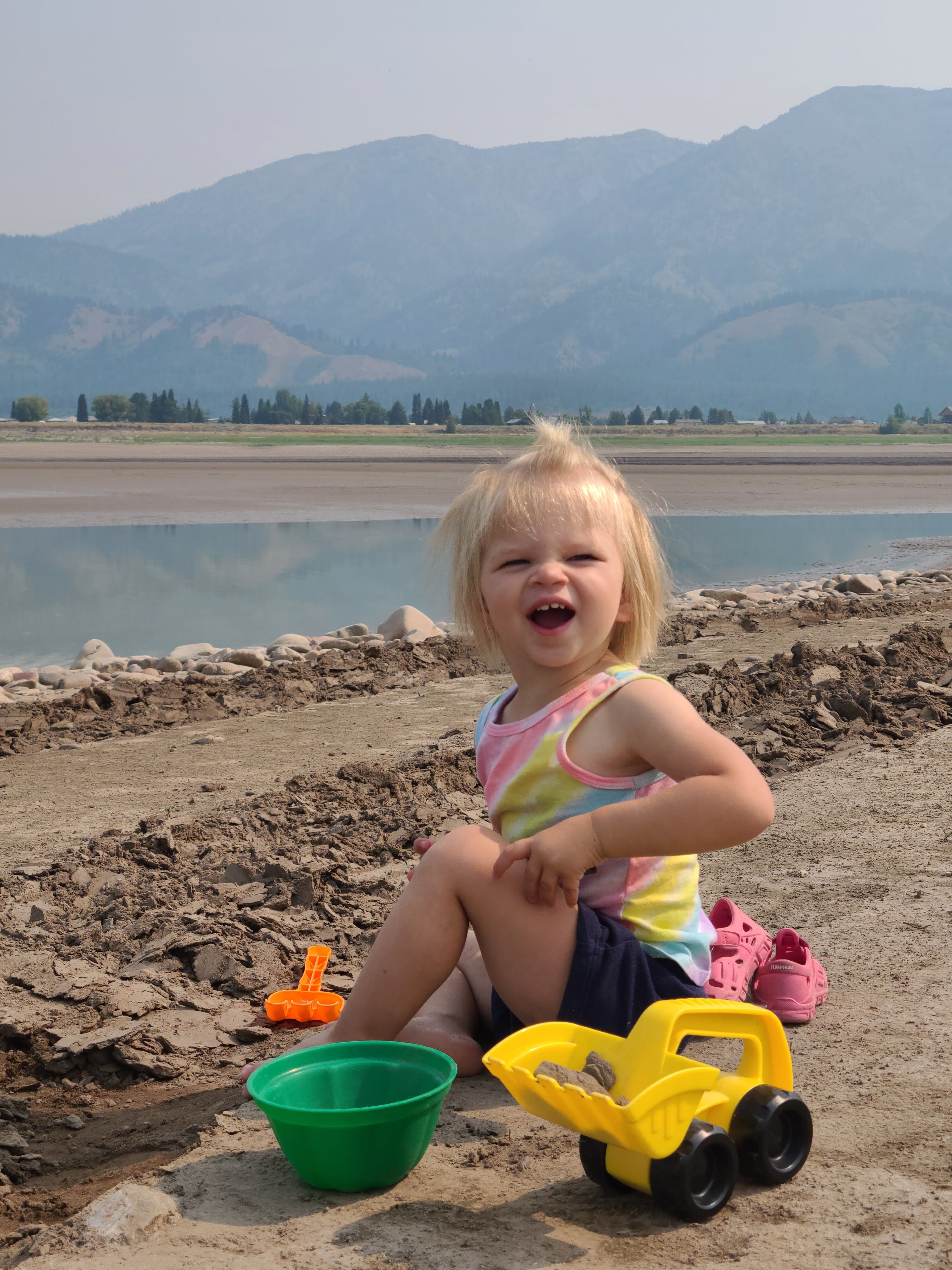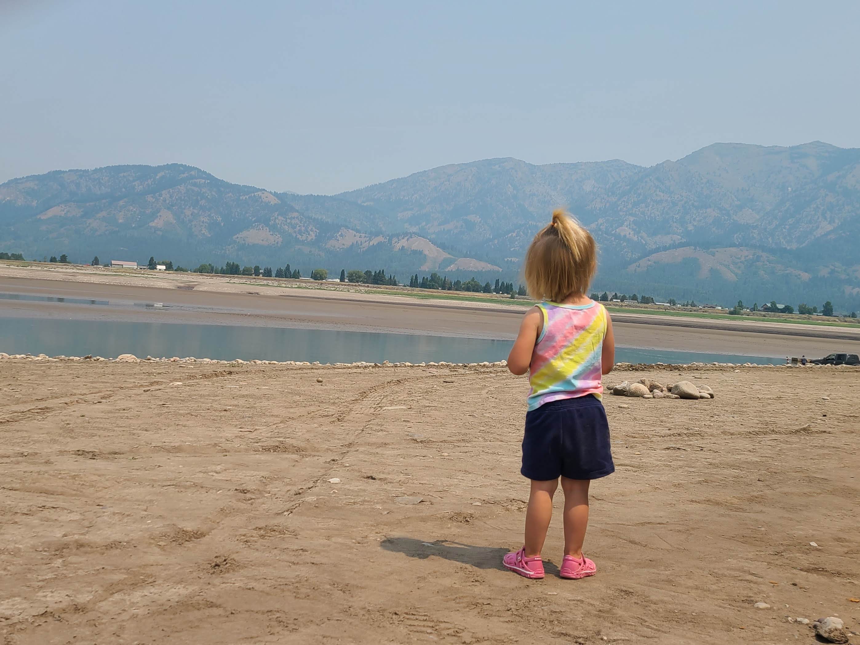 While we were incredibly disappointed to have to cook our own dinner (we had planned on eating at the brewery), we actually had a very pleasant night with incredible views of the lake. The lakeshore was not inviting and nearly cost me a sandal, but Bird seemed to understand the mud trying to suck me into the earth was not conducive to playing in the water, so she was content to dig in the sand around the camper and explore the vast open area between us and the brewery.