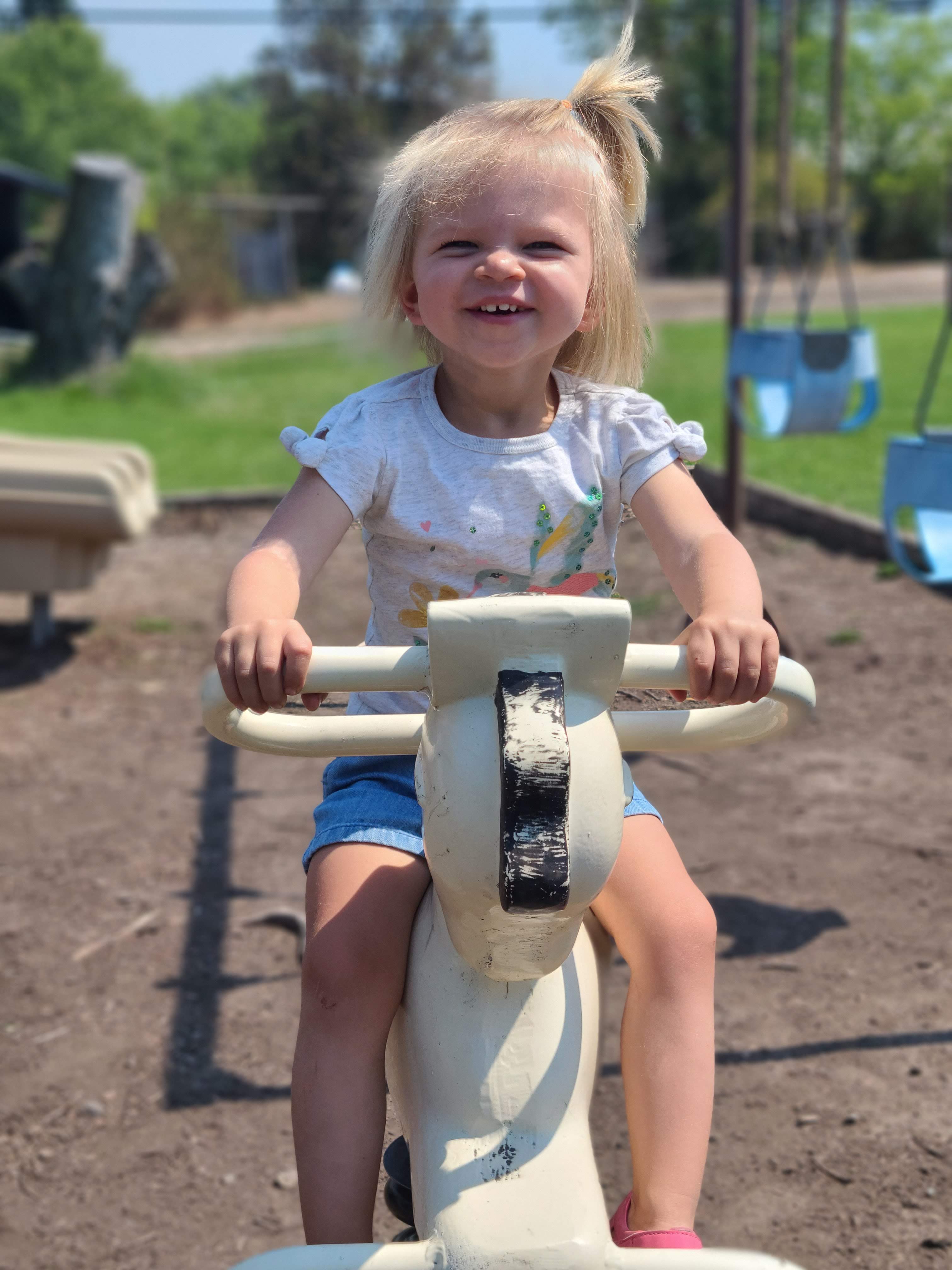Before heading too far into the mountains where the lake and state park were located, we found a little playground in a teeny tiny town that suited Bird and our needs for lunch and some outside time perfectly. There were even chickens living next door with a very vocal rooster. Bird has been perfecting her cock-a-doodle-doo and spent most of our lunch conversing with the rooster.