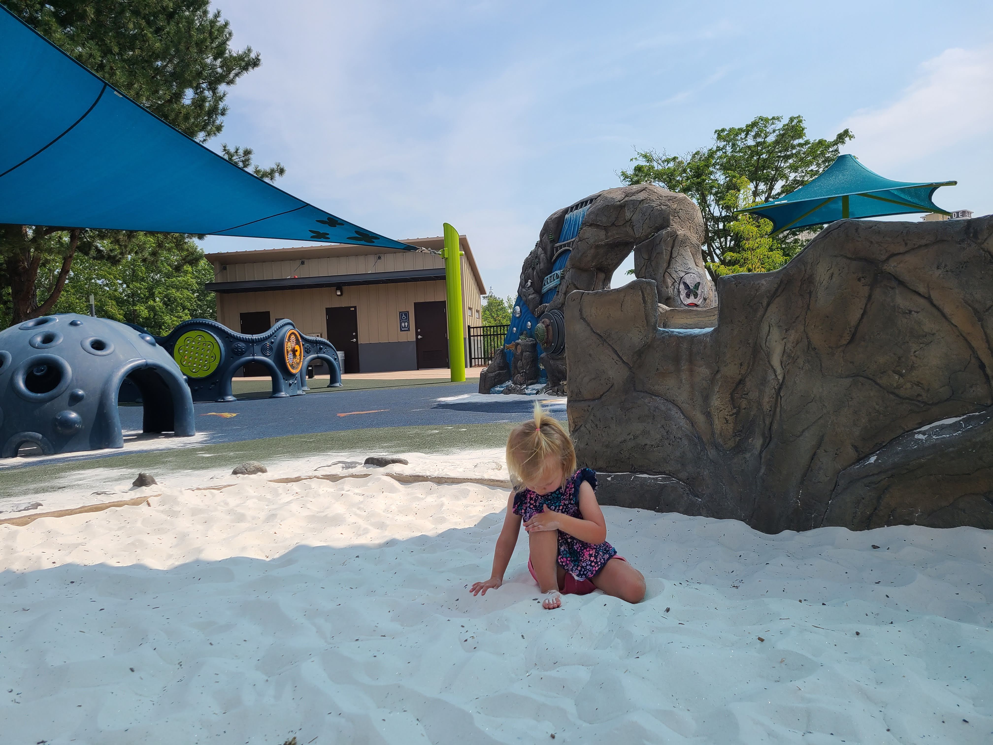 While Bird and I put our feet in the sandbox at a shaded area of a playground, Will and Daisy found some relief under a tree. Bird could have stayed and played in that cool sand all day (and I really could not argue), so there was some minor protesting when we went to leave. She is so go-with-the-flow, though, that after a second of being upset, she got excited for the rest of our plans (mostly because there were chicken nuggets involved) and went merrily along her way.
