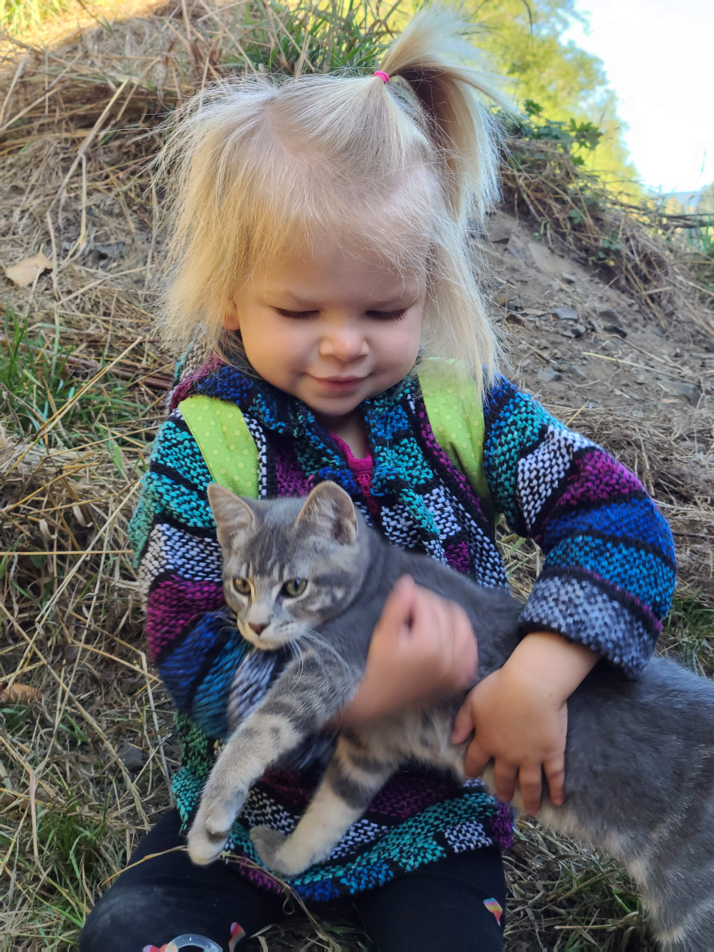 We were greeted immediately by Petunia, the potbellied pig, who got up in Bird’s face and got mud all over her outfit, which did not start things off on the right foot, according to Bird (who is still holding a grudge when pigs are mentioned). However, Petunia was followed closely by 2 small kittens, and Bird fell immediately in love (this love was unrequited on the first day, but very much indulged in the following morning). Mama cat even got in on the love.