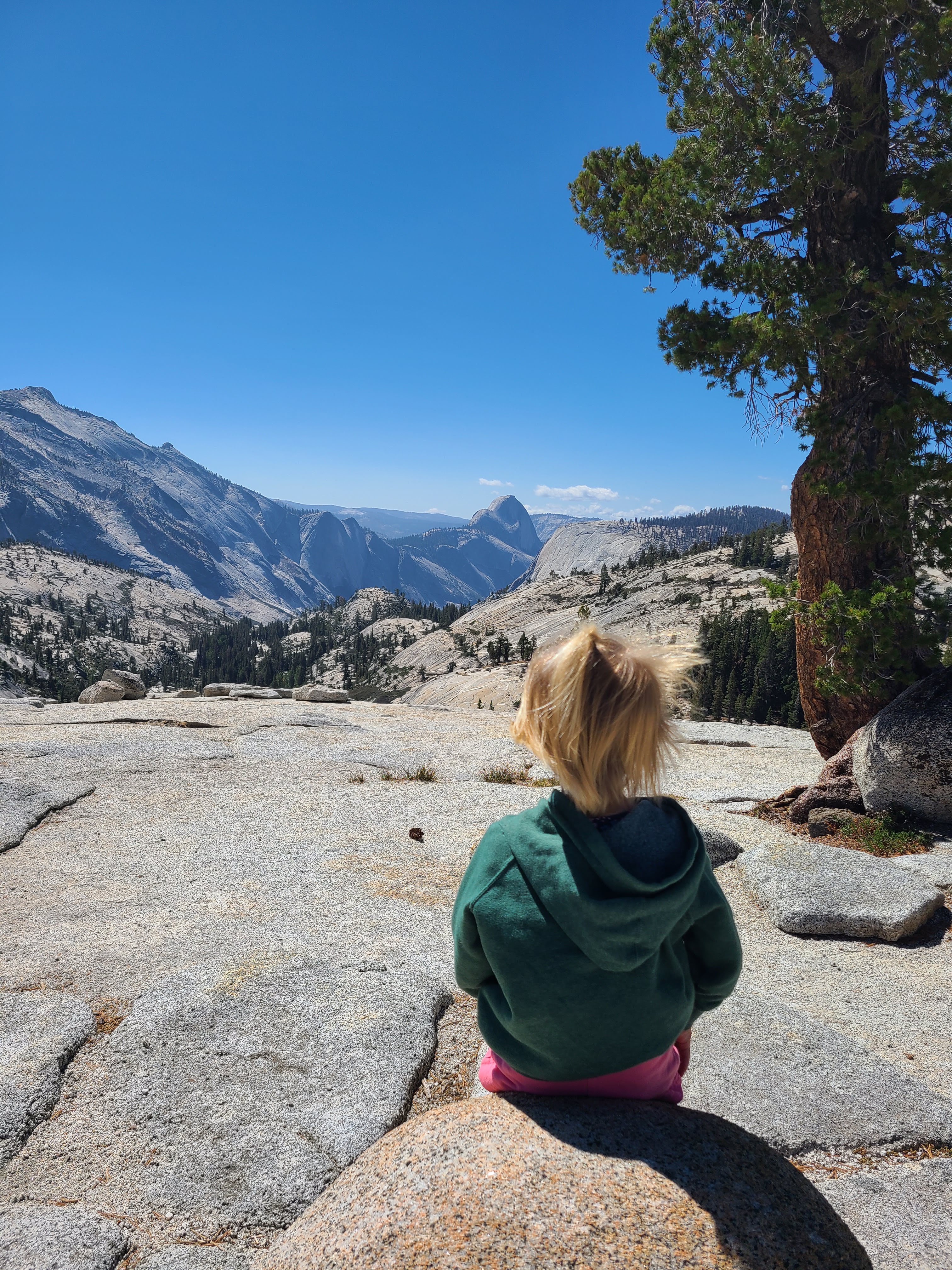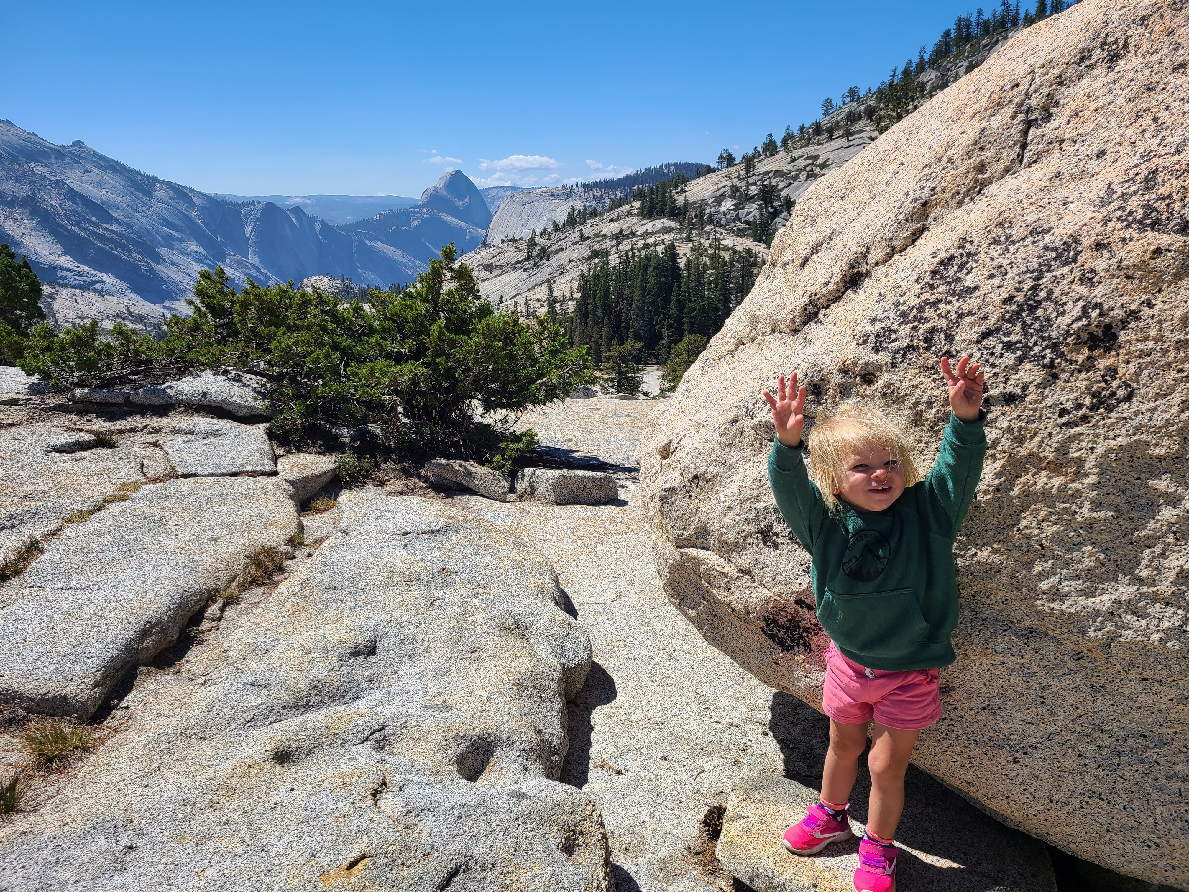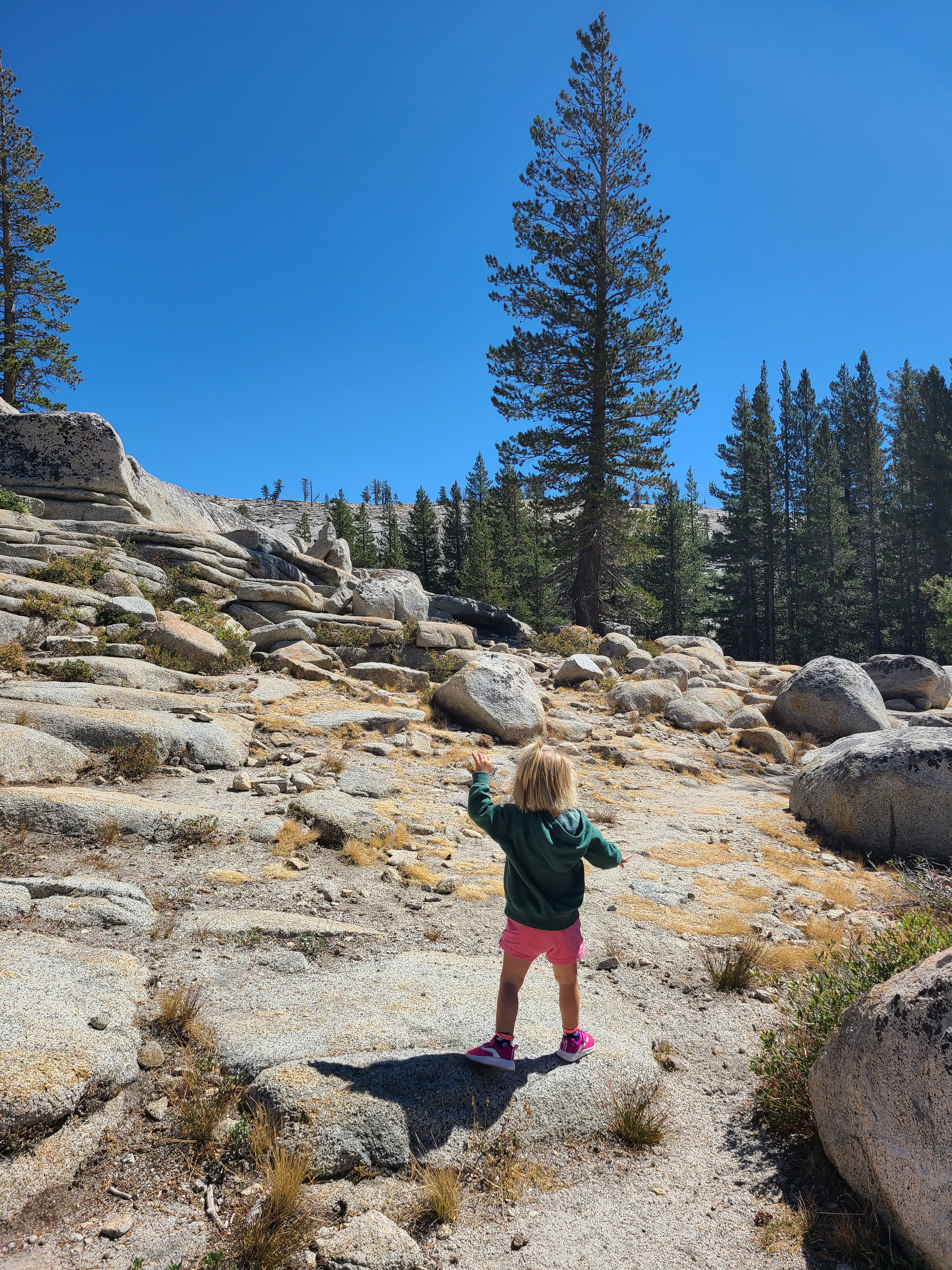 Even though we did not see and do everything we wanted in Yosemite, Bird and I did hike out to Olmstead Point and enjoyed an incredible view of Half Dome (sorry, Daisy, no dogs allowed). While the hike was not difficult, there were lots of rocks to navigate, and Bird truly never ceases to amaze me. She has an eye for finding the best route and is sure-footed in ways that make me proud and oh-so nervous (she may not remember a mere year ago when she refused to let go of our hands and walk on her own, but we sure do!). However, her love for “rockos” is big, and there is no way we were going to miss an opportunity to get a little exploring in on an otherwise truck-heavy day.