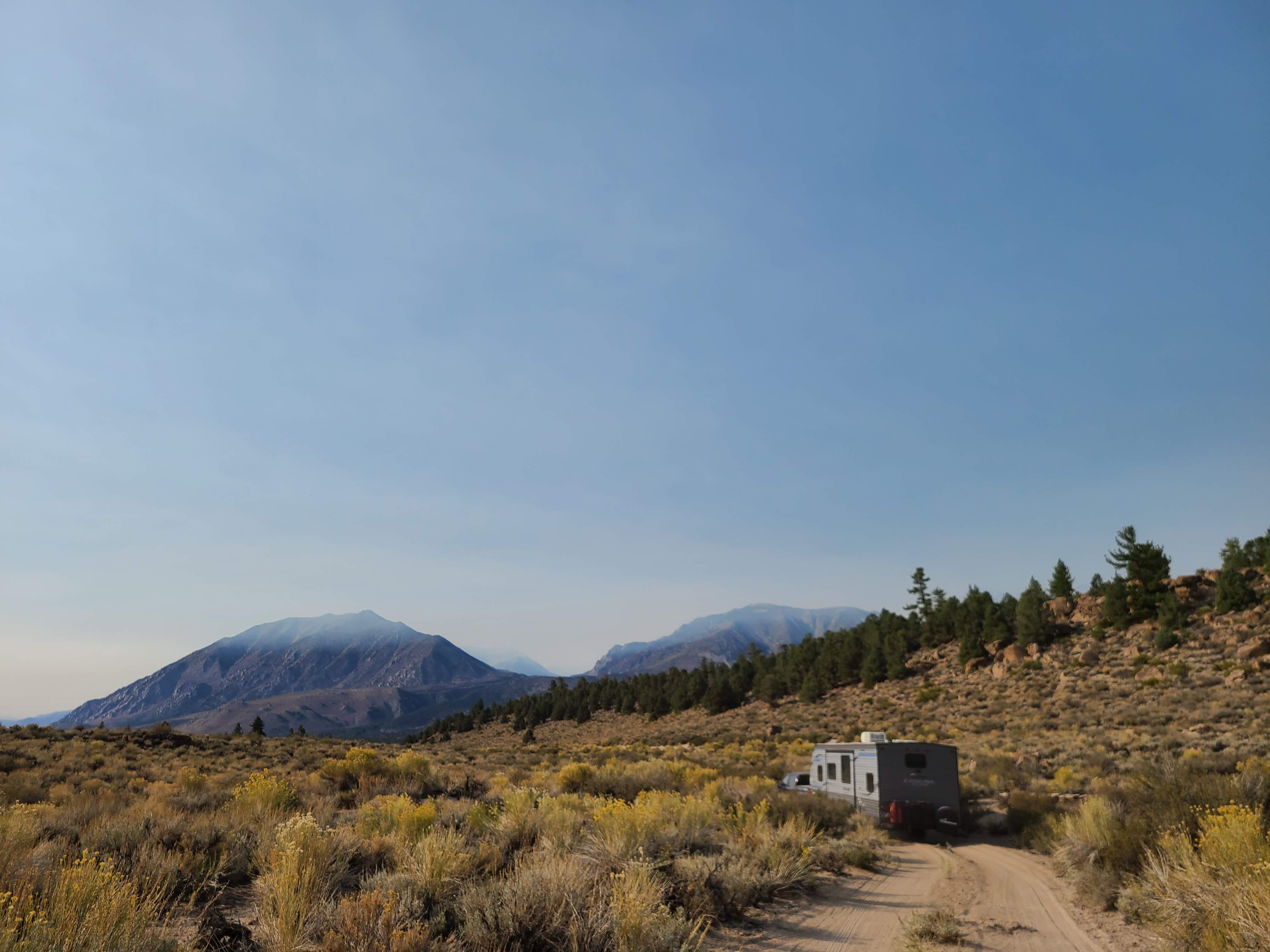 The first night we spent at Owen’s Gorge Road dispersed camping in California. As we pulled off the main road, we expected to quickly come across several camp sites, but instead, we encountered lots of smaller Forest Service roads that led off in every direction and were far too small for us to navigate while towing (and not knowing what we would encounter). So, while I am certain there were many spots available down these roads based on the reviews we read, we traveled a couple of miles down the main dirt road until we found an easily accessible spot.