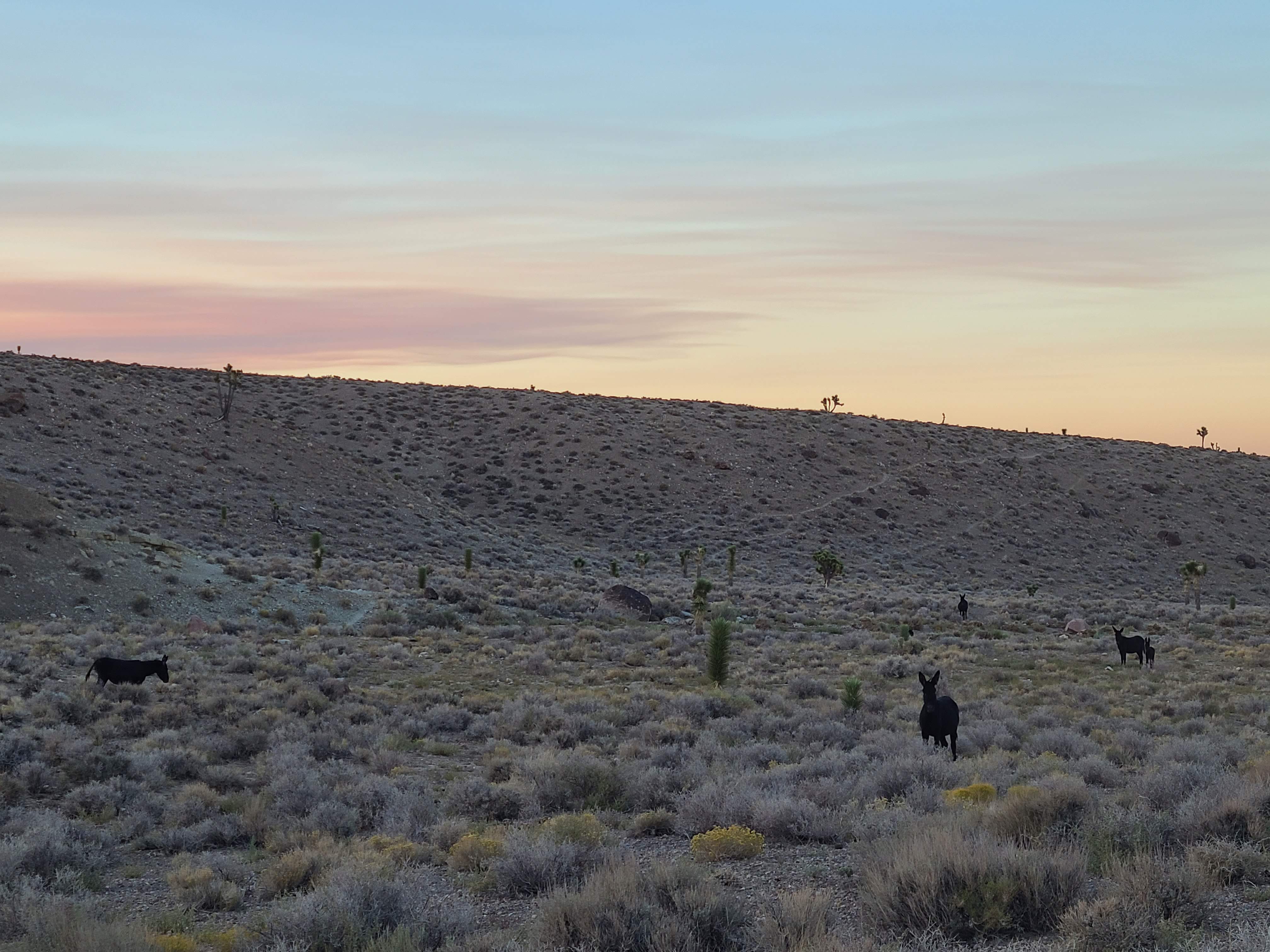 We found a couple of camp sites fairly quickly and settled on the second 1 that gave us great views and ample space. There were trails leading off across the landscape in every direction, and as we explored, we continually saw lots of poop. Donkey poop. While several of the reviews we read had mentioned the “wild burros” that occupied the area, we were surprised to see so many signs of their presence. After dinner, we decided to further investigate to see if we could find them, and low and behold, we found a small group of them hanging out right down the road. What a treat!