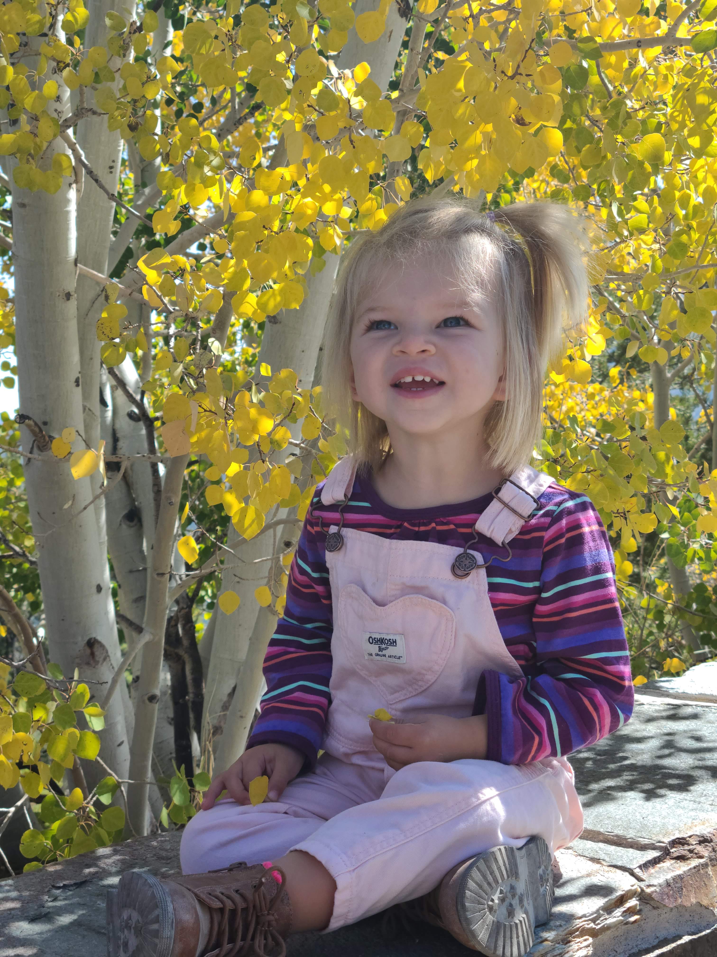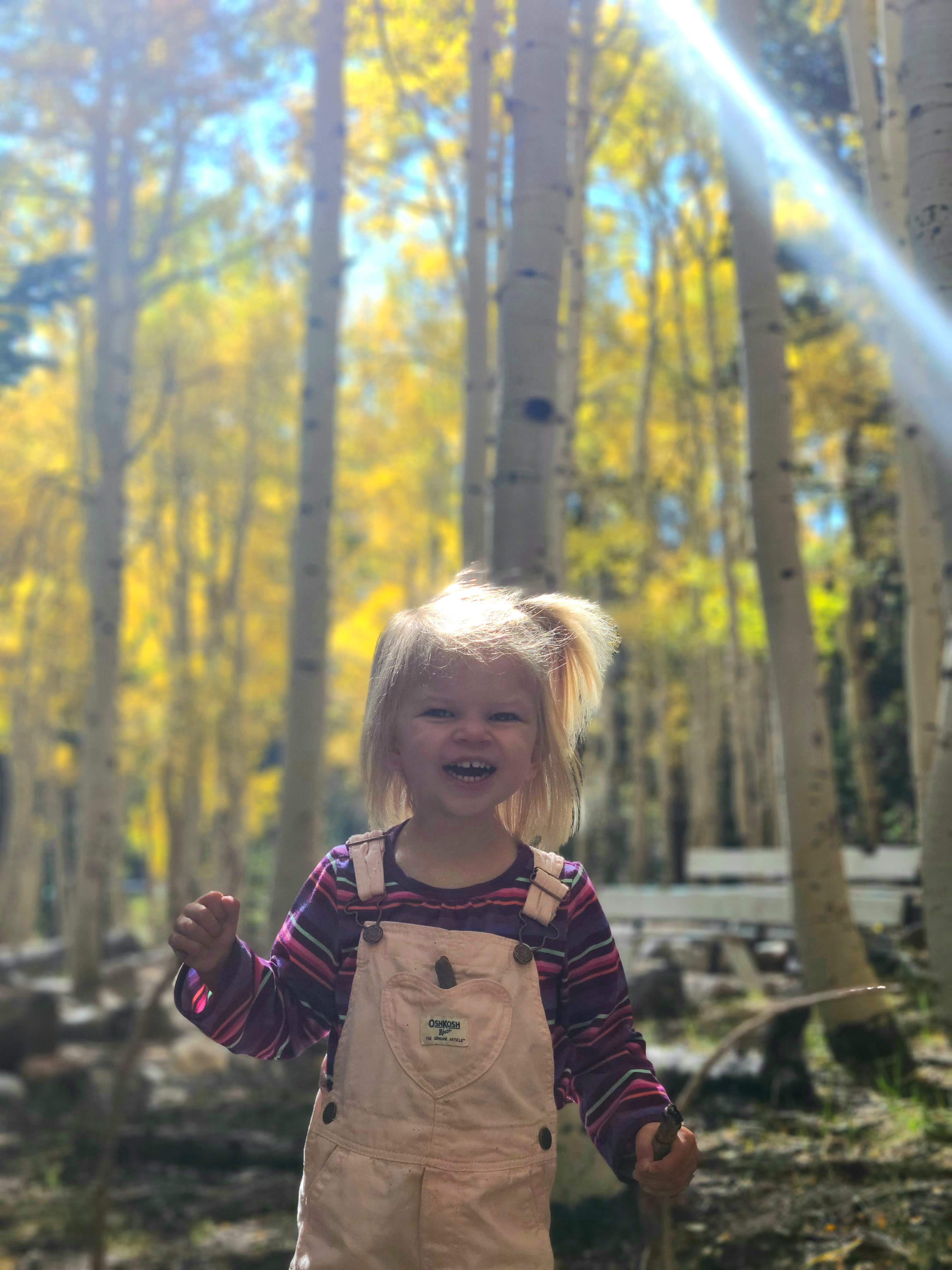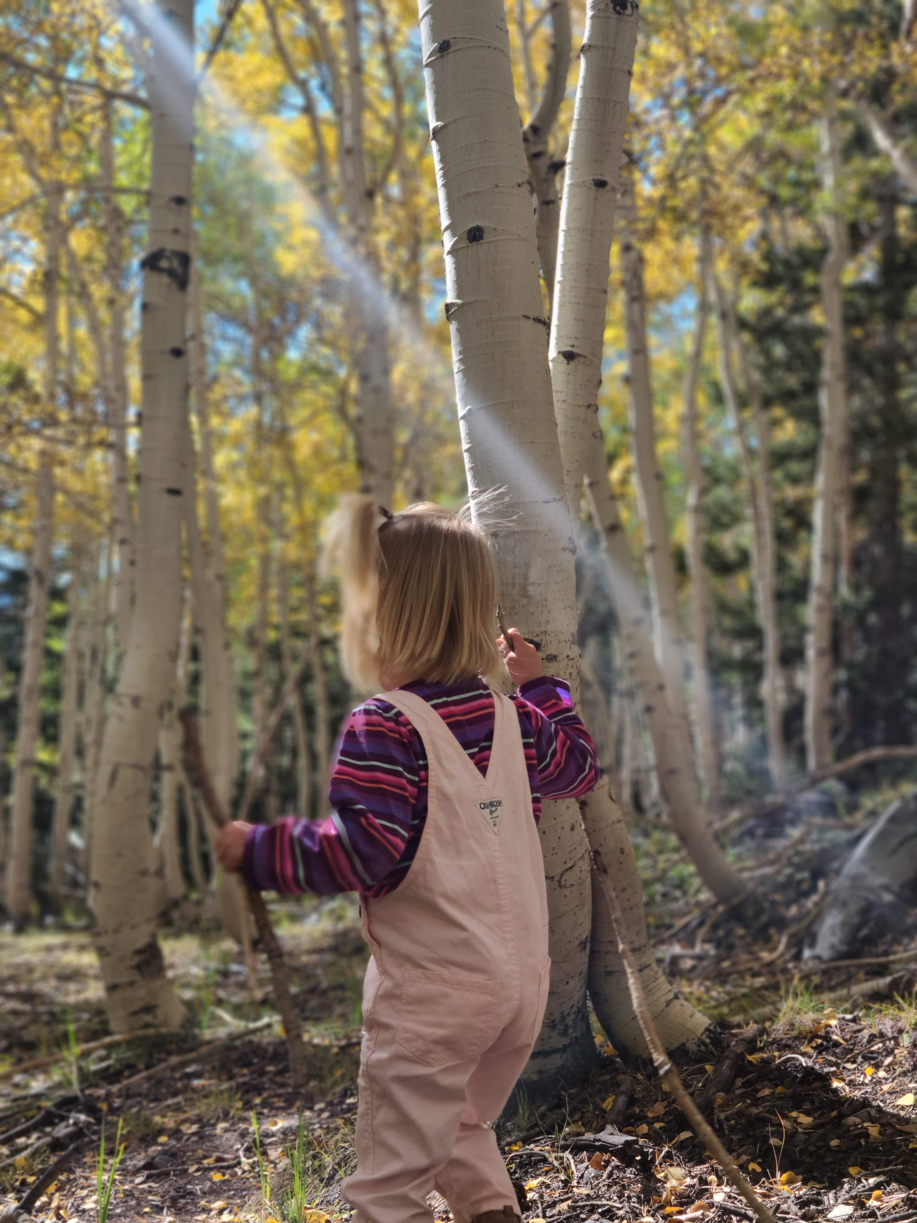At the top, the road abruptly ends with trailheads in every direction going to several lakes, groves of bristlecone pine trees that are only found in this specific ecosystem, and leading to the summit of the peak. Even though the parking lot was crowded, we found a makeshift spot and got out to fully enjoy the golden leaves around us. After we took a few fall family photos, Bird and I explored the aspen groves a little further from the parking lot. Her sense of adventure truly knows no bounds and she is so full of a desire to experience everything around her. It is so much fun to see what will catch her attention, and we picked up sticks, rocks, and pinecones and compared different leaves. She wanted nothing more than to keep going deeper and deeper into the woods, but knowing Will and Daisy were waiting for us, we kept it short and sweet.