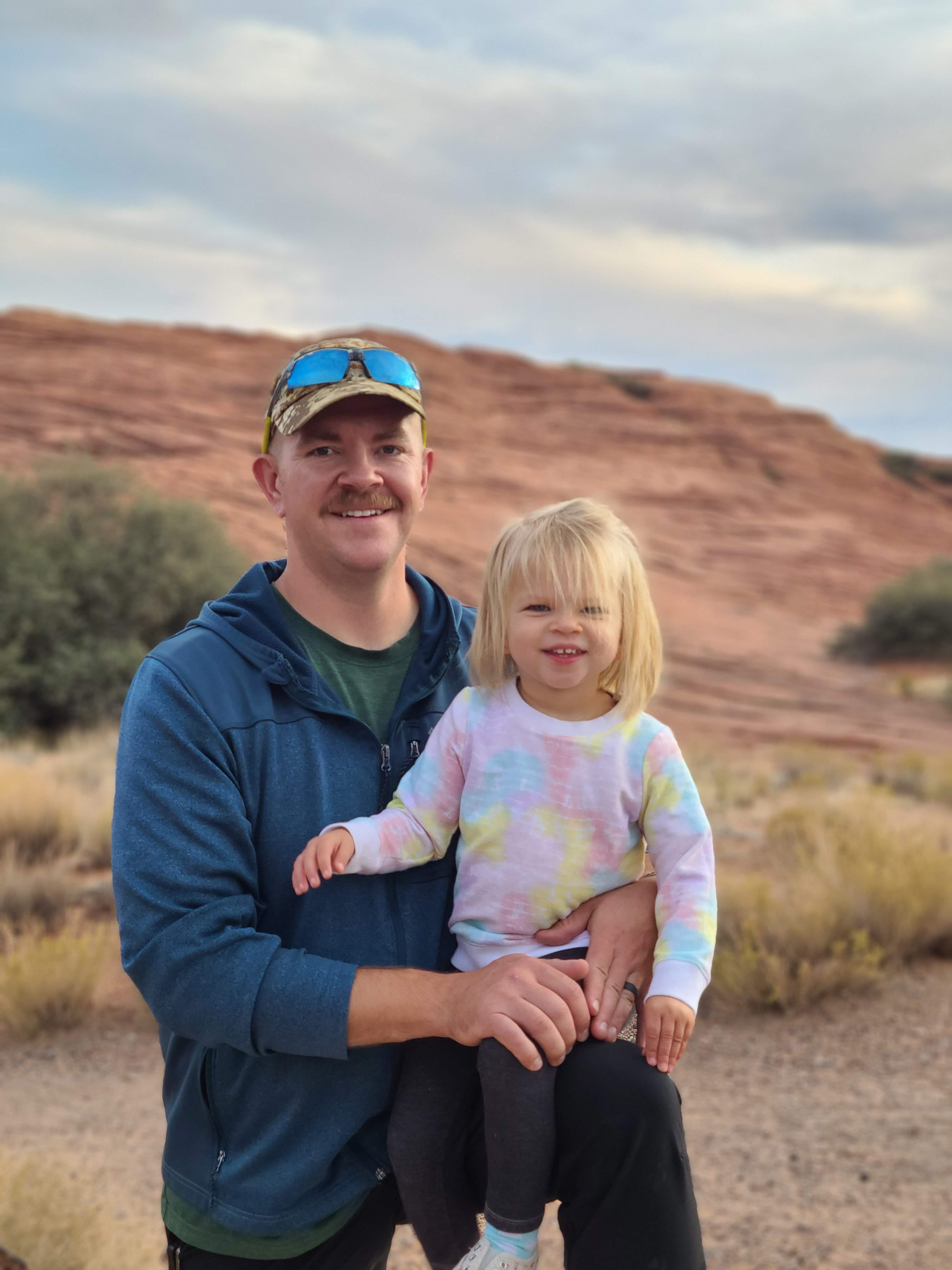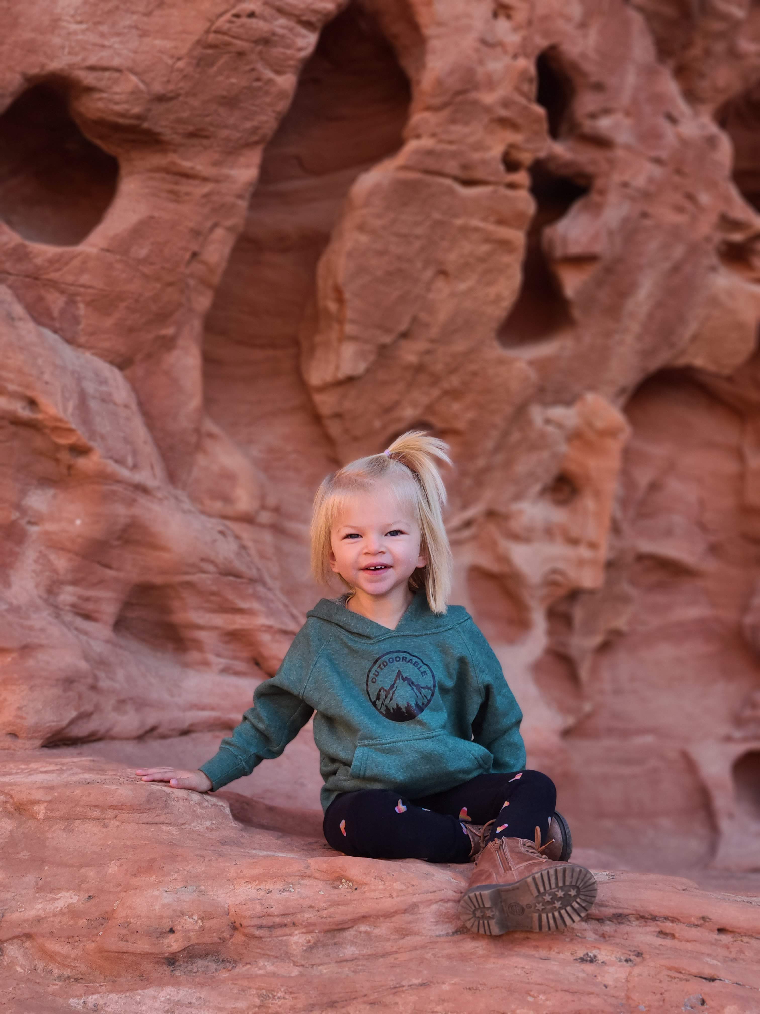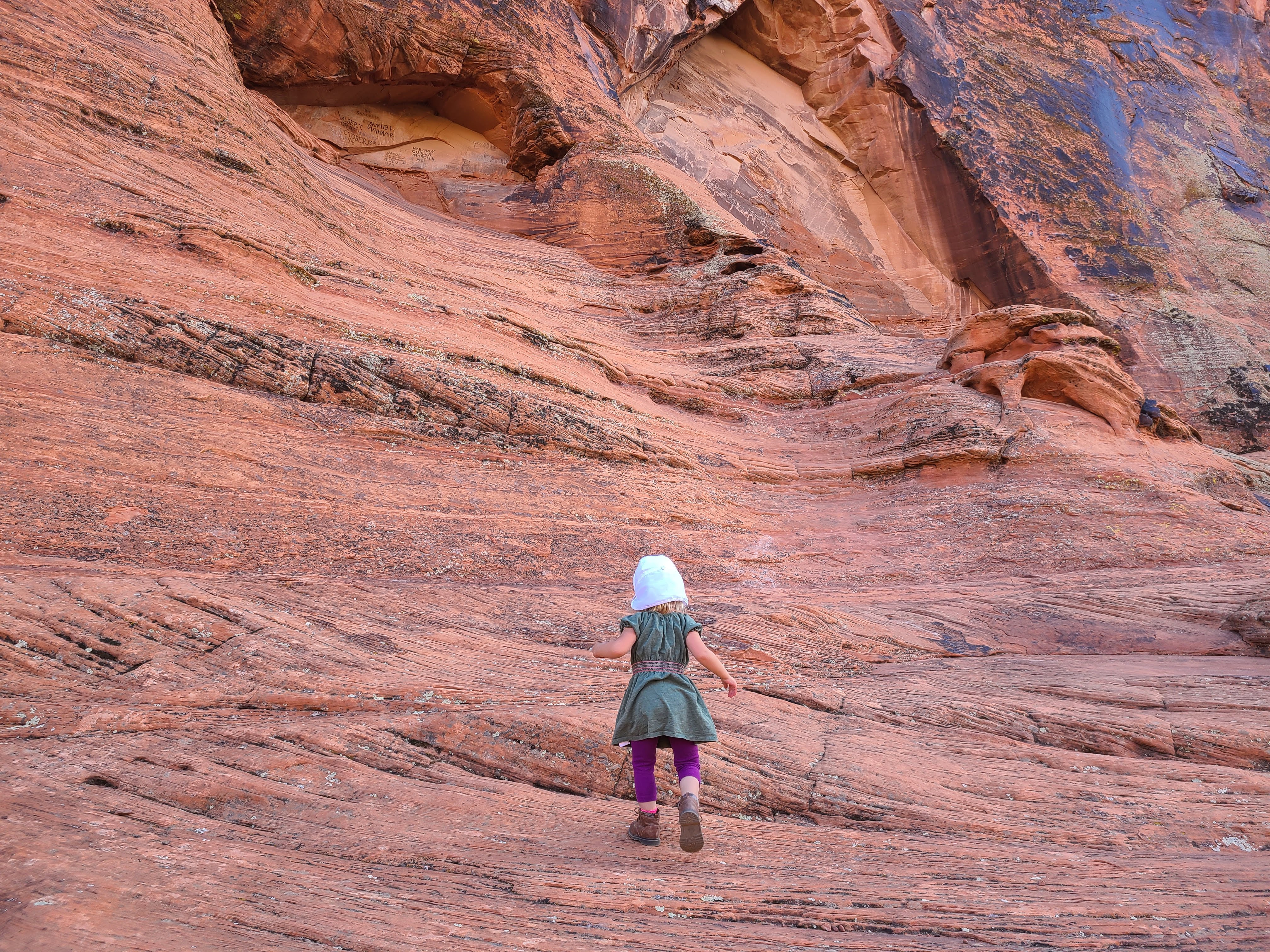 However, the main attraction for Bird in the entire park was Galoot Rock, or “Big Rocko,” as she lovingly referred to it. The spot where we stayed was at the base of Big Rocko, so it was an easy place for us to visit. While there was some access up the rock from the road on our side at Lower Galoot picnic area, the best access to scramble up the rock was from Upper Galoot picnic area just up the road. The Navajo sandstone that makes up the rock is very easy to walk on and is very seldom slippery, making it great for scrambling and climbing on. Bird absolutely loved this rock and aside from us requiring her to hold our hand in places or be carried closer to the top, she was able to explore on her own.
