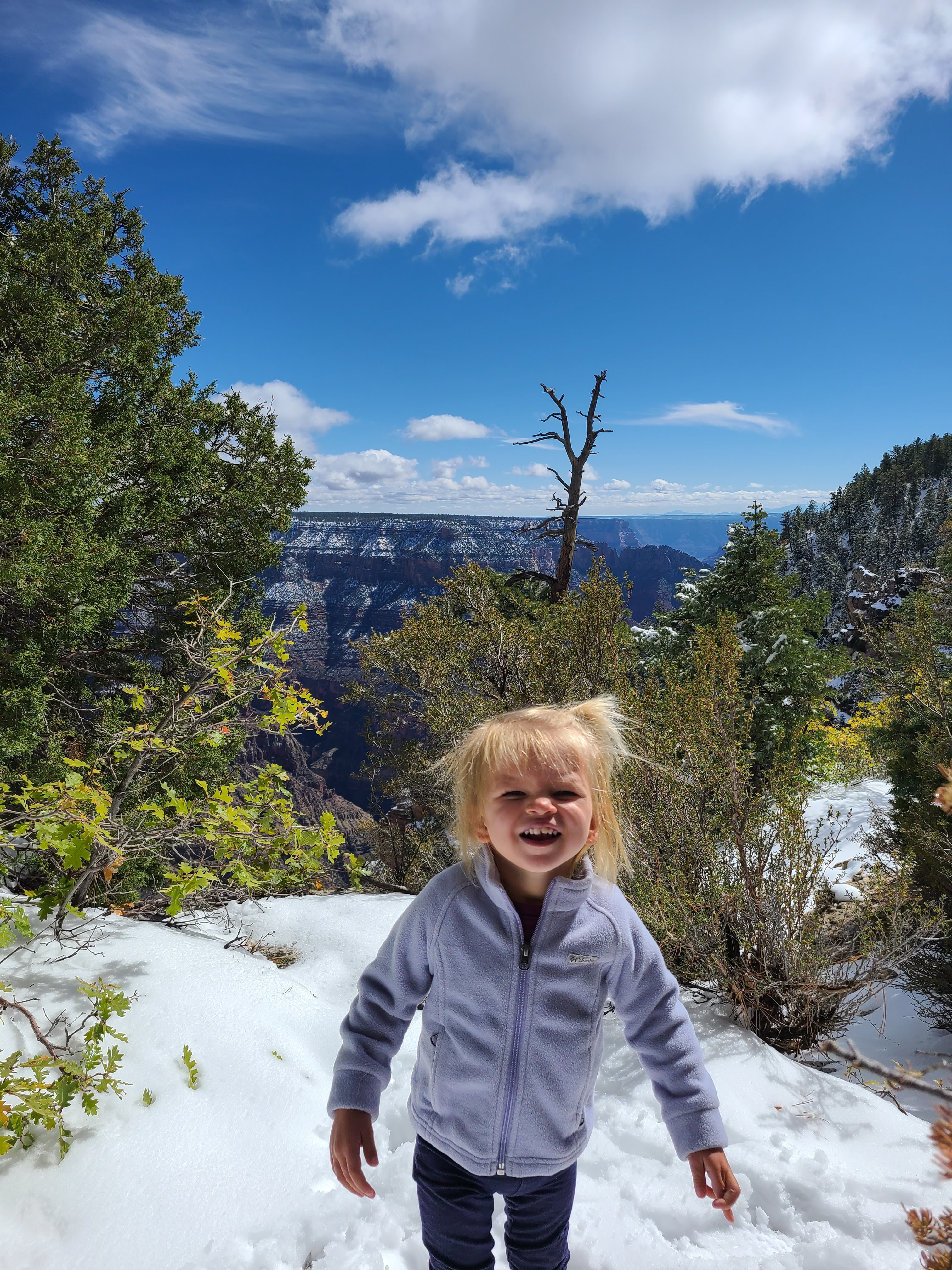 After lunch, we got out of the truck, bundled us all up, and made our way up the hill to get what would turn out to be our best view of the Grand Canyon as a family. We strategically moved around trees to better our view, then decided to make the best of the situation and let the girls enjoy the snow.
