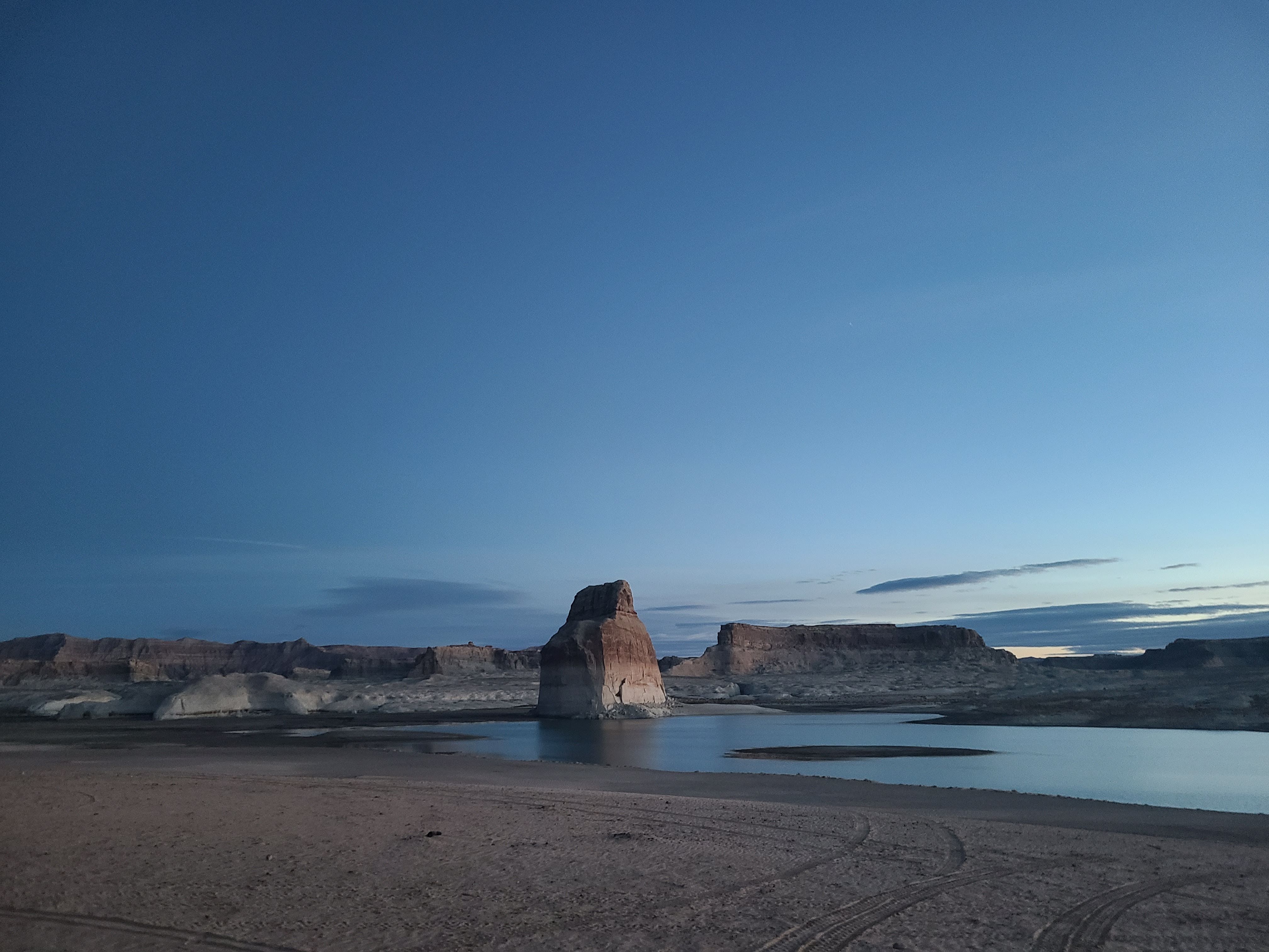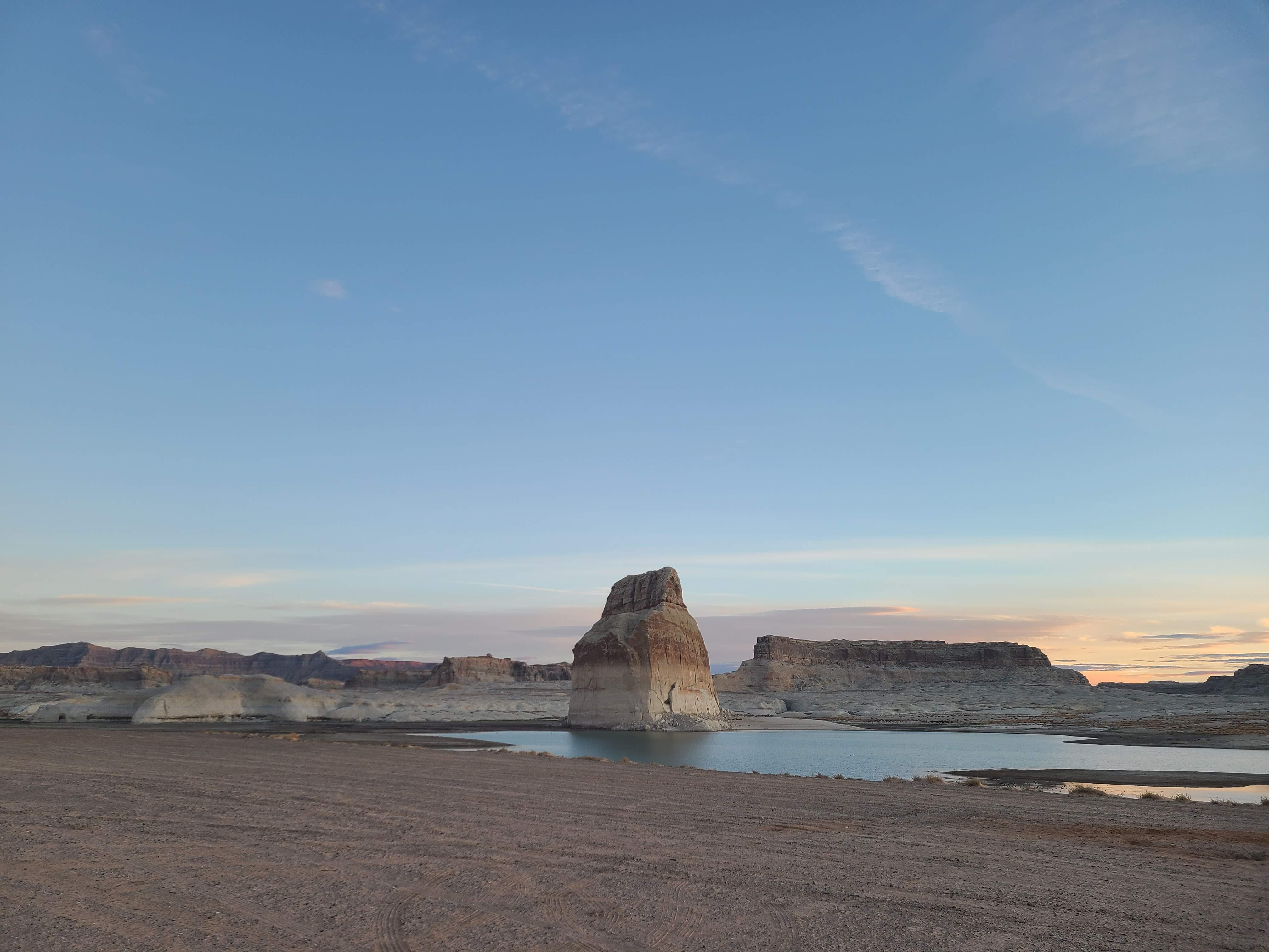 In an effort to keep my morning routine going, I woke up before sunrise to take a walk around the camping area. I made my way down toward Lone Rock and found even more distressing evidence of the lake drying up.