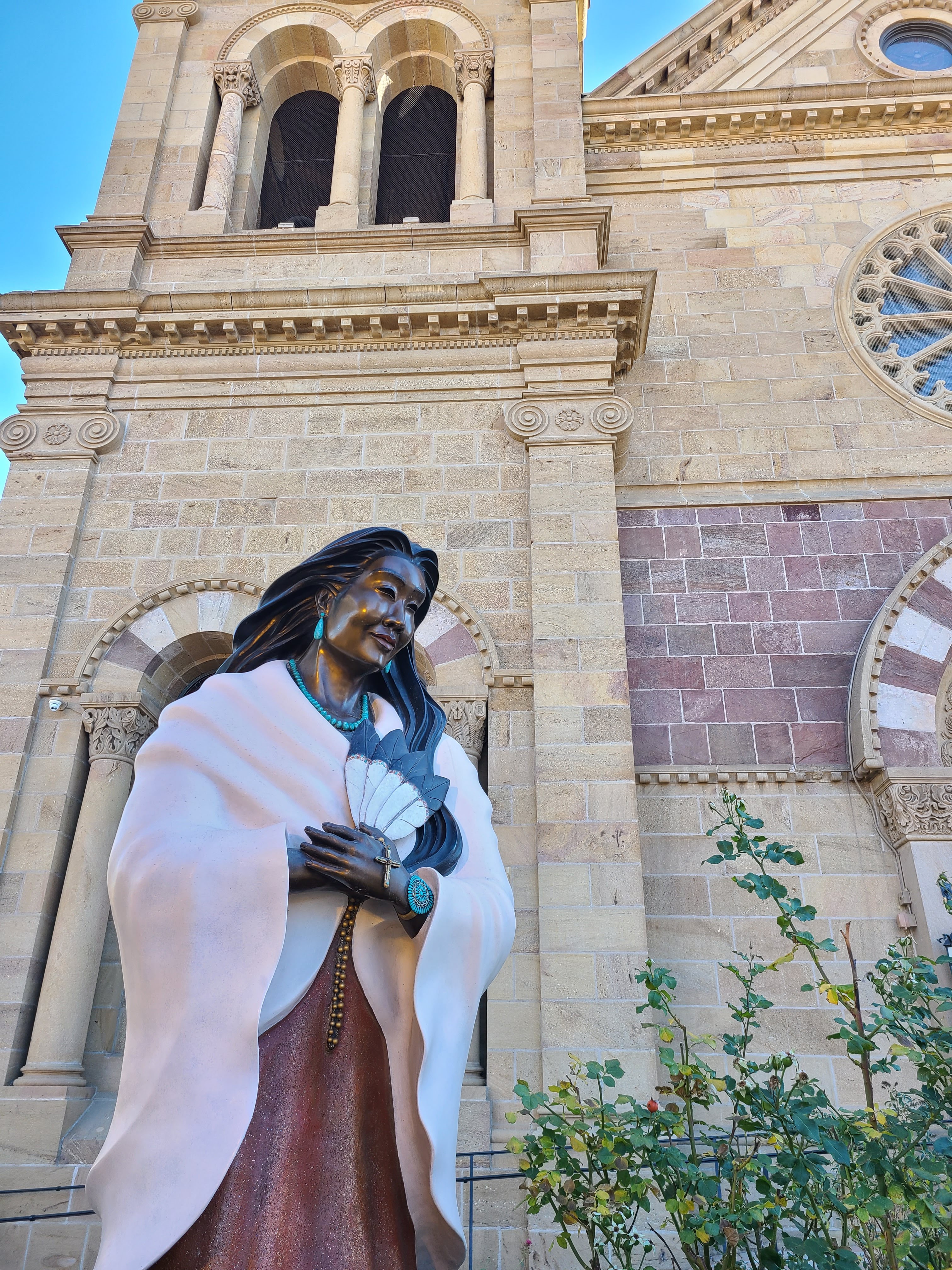 We began our visit at the Cathedral Basilica of St. Francis of Assisi. While the church itself was closed for the day, we were able to walk around the prayer gardens and enjoy the various statues around the building. I was particularly drawn to the beautiful statue of St. Kateri Tekakwitha, the first American Indian to be canonized. She is the patron saint of American Indians and the environment. I had mixed feelings about this statue, because, on one hand, it is an incredible tribute to this woman and her life’s work, but on the other hand, it is further evidence of American Indian culture, spirituality, and customs being taken over by others (namely Christianity). While I could hope that there is a melding of Catholicism with the American Indian beliefs, that does not really seem to jive with the history of the Catholic Church. Regardless, the statue was beautiful.