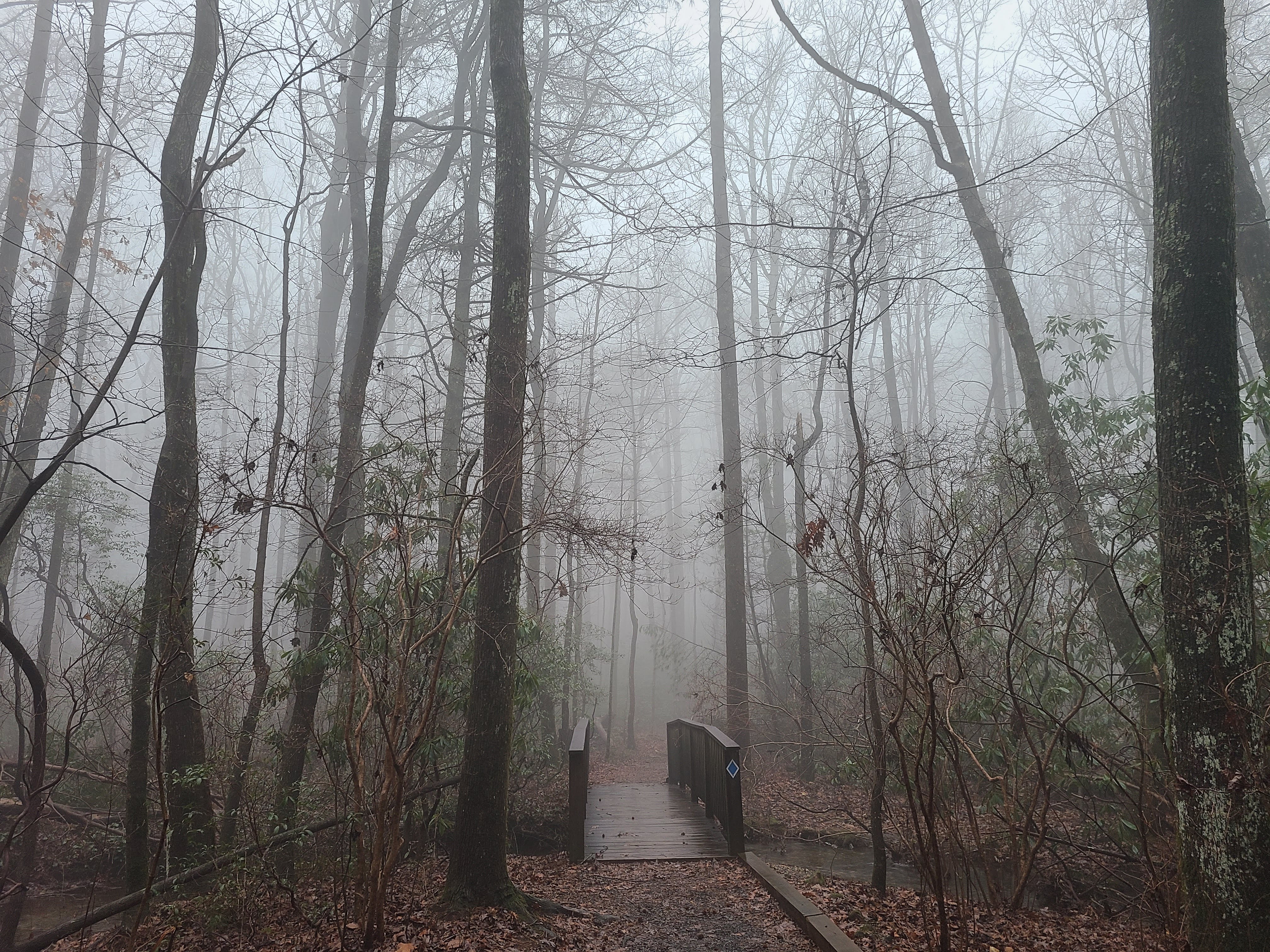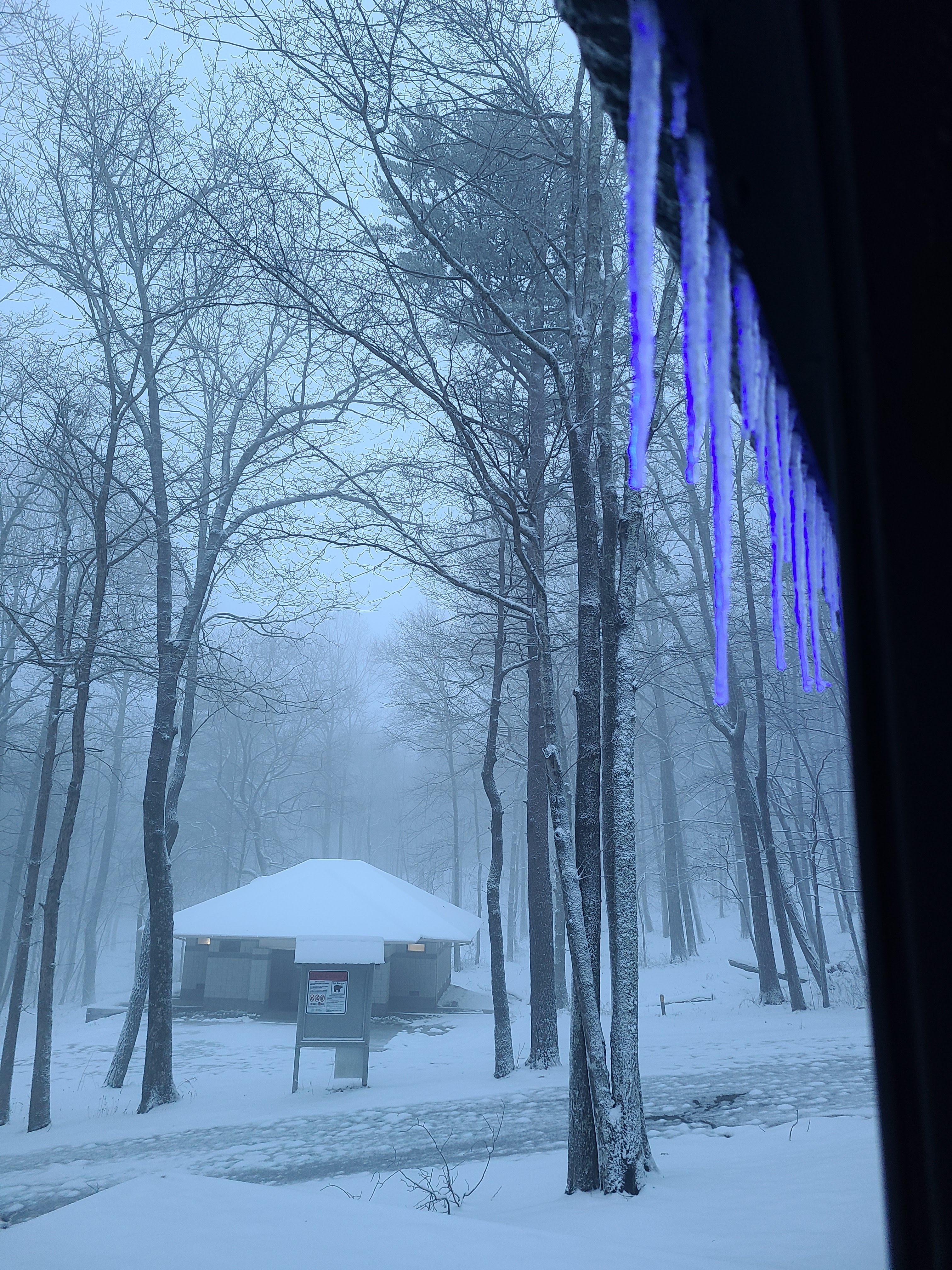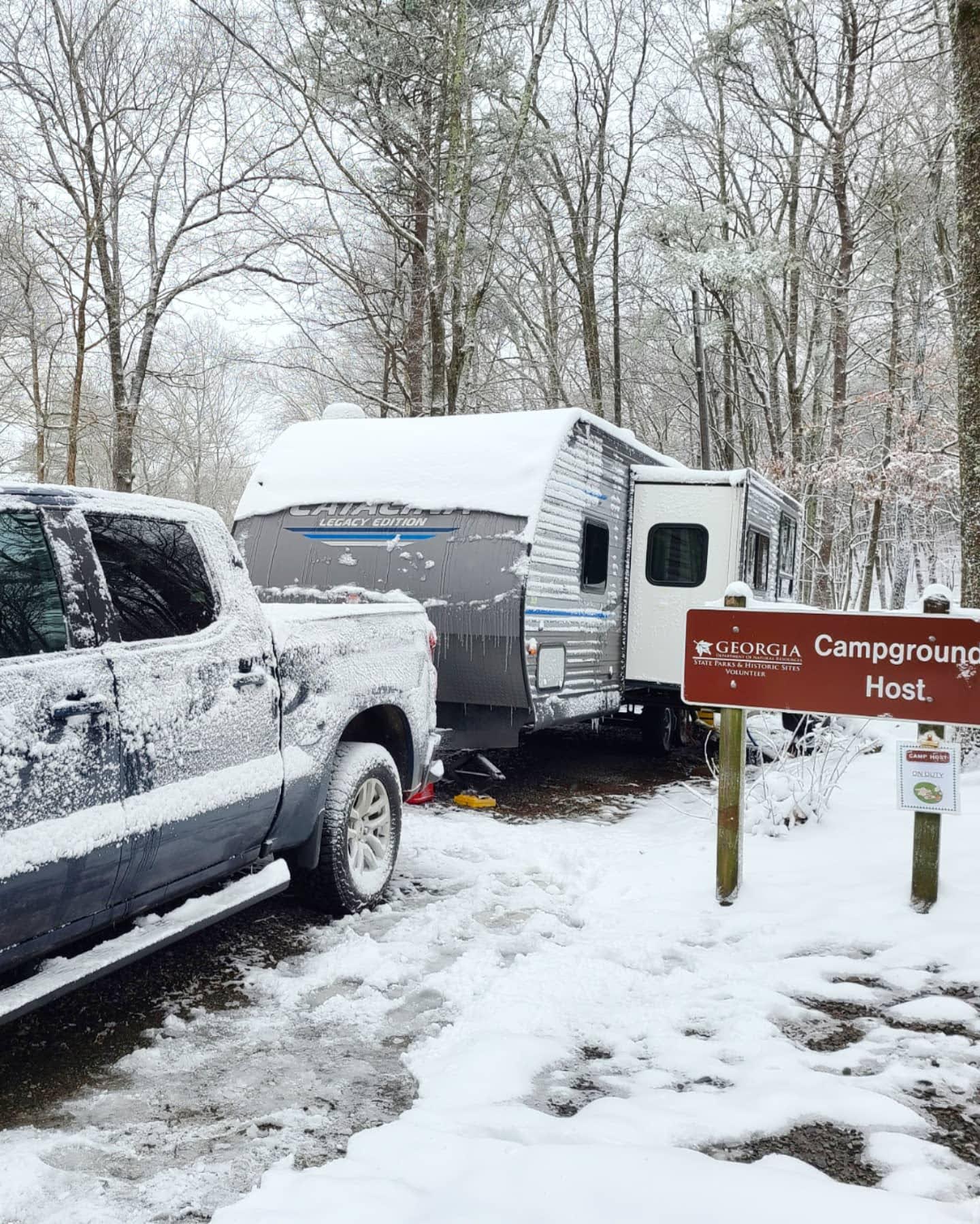 We arrived at our new camp hosting position in time to ring in the New Year. We knew going into the mountains of Northern Georgia that we had the potential to face winter weather during our 3-month stay. However, we did not imagine that we would face fog, rain, freezing rain, 5 inches of snow, and below-freezing temperatures all within our first week at the State Park (and the weather has not improved much since then, either).