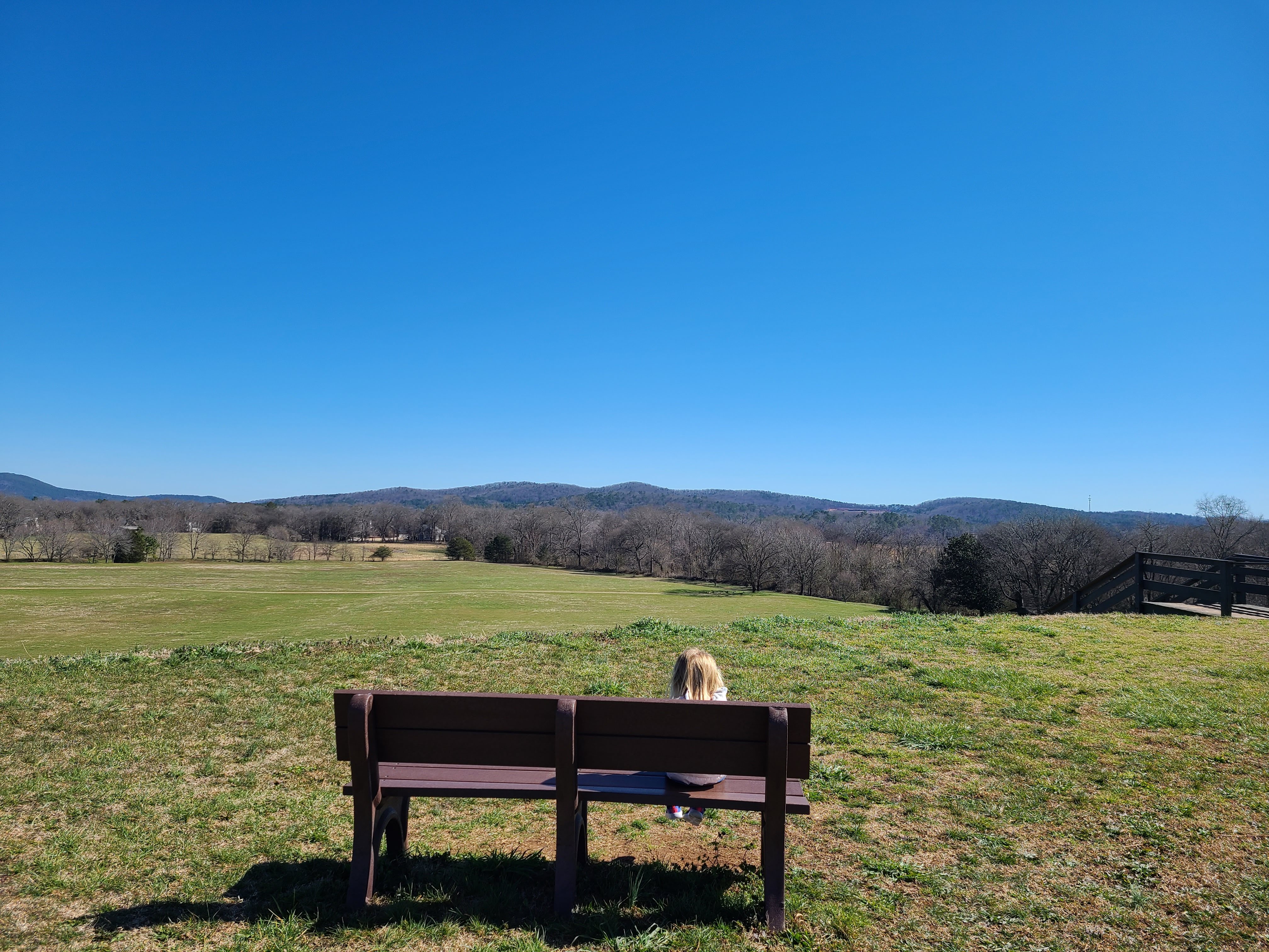 The taller mound is currently around 65 feet tall, and it was known as the Temple Mound (I guess I did learn a little bit). I do not know how many stairs there are to the top, but Bird again killed it, slowly and deliberately making her way 100% on her own to the top…with several stops and gasps of “wow!” along the way.
